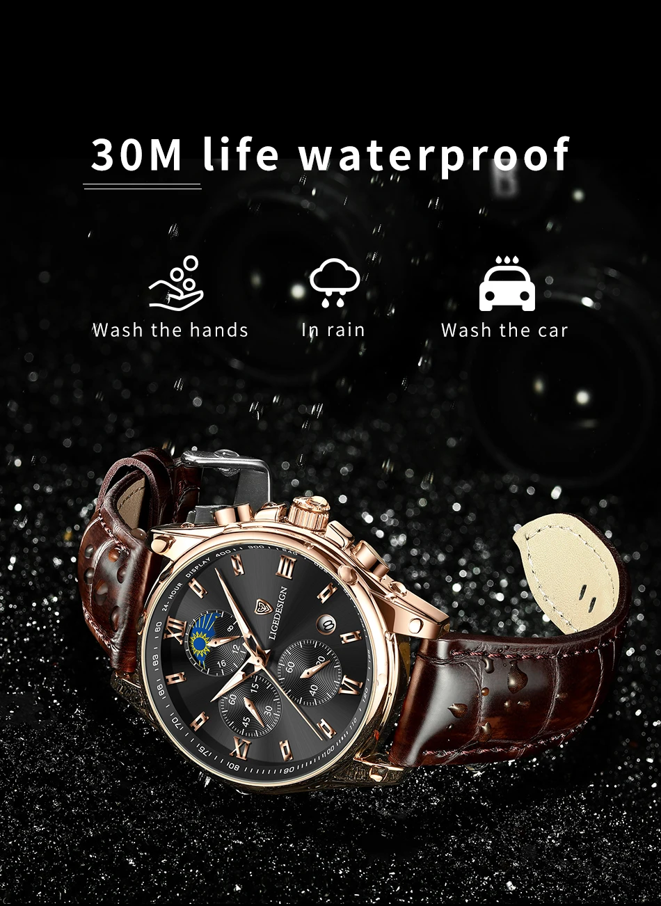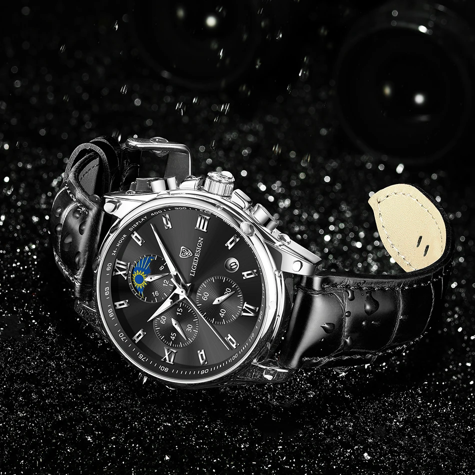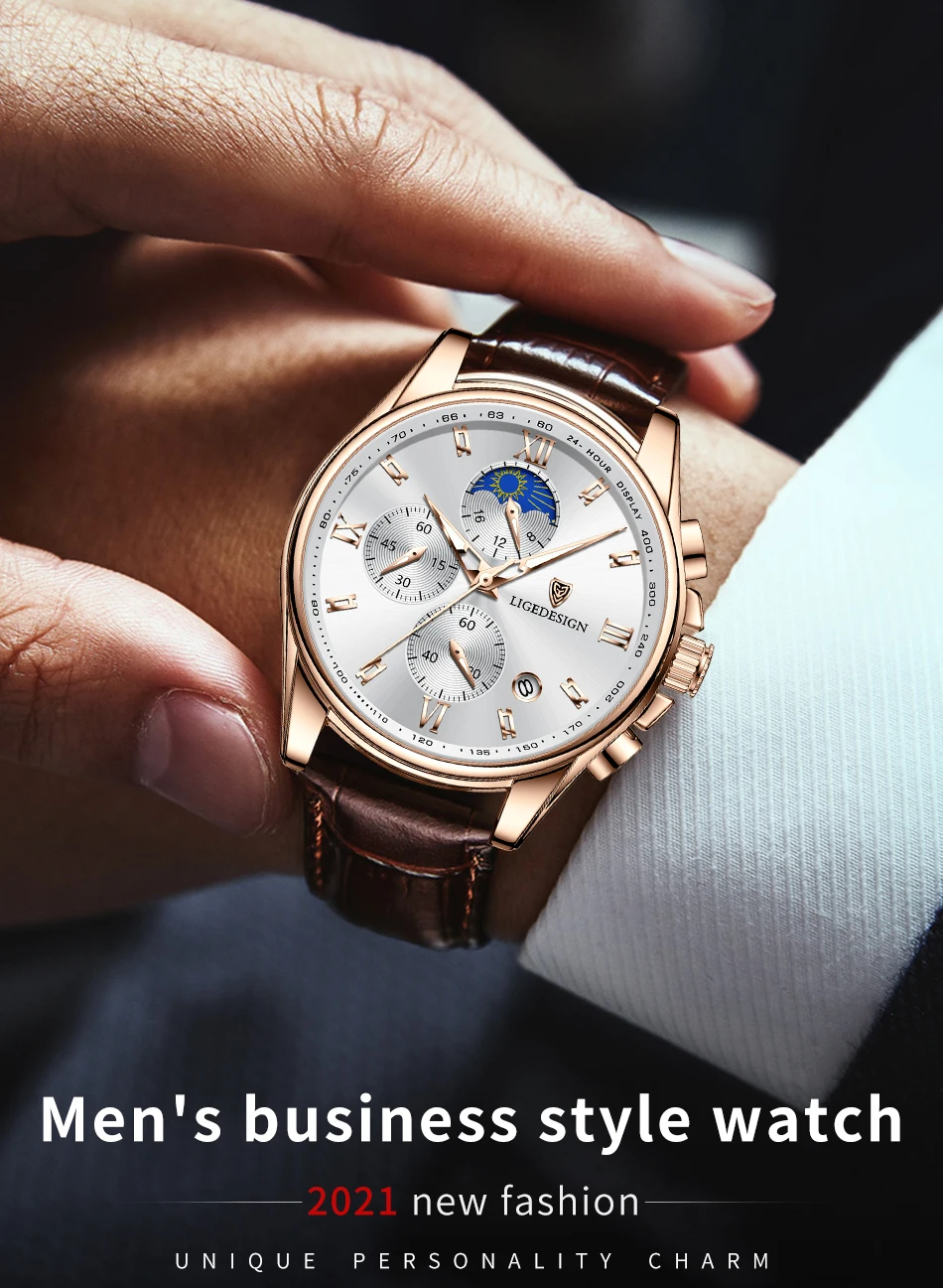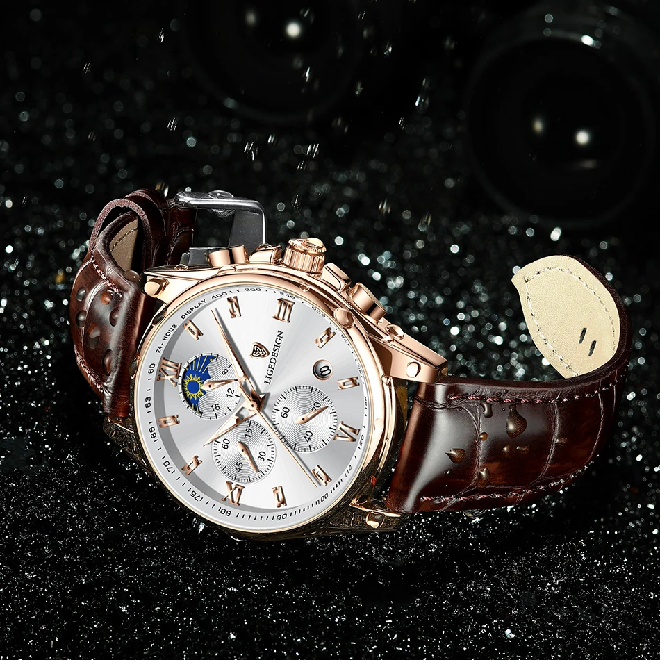 Новые норковые часы LIGE. Золотисто-белый циферблат. Это стильные деловые часы и часы для отдыха. Он имеет функции, такие как хронометраж, автоматический календарь, водонепроницаемый, ударопрочный, световой, 24-часовое испытание фаза Луны; Подходит для всех случаев.Основные характеристики: