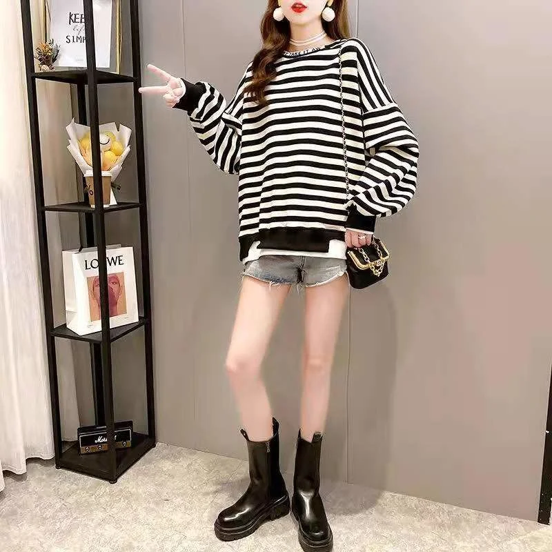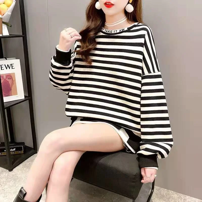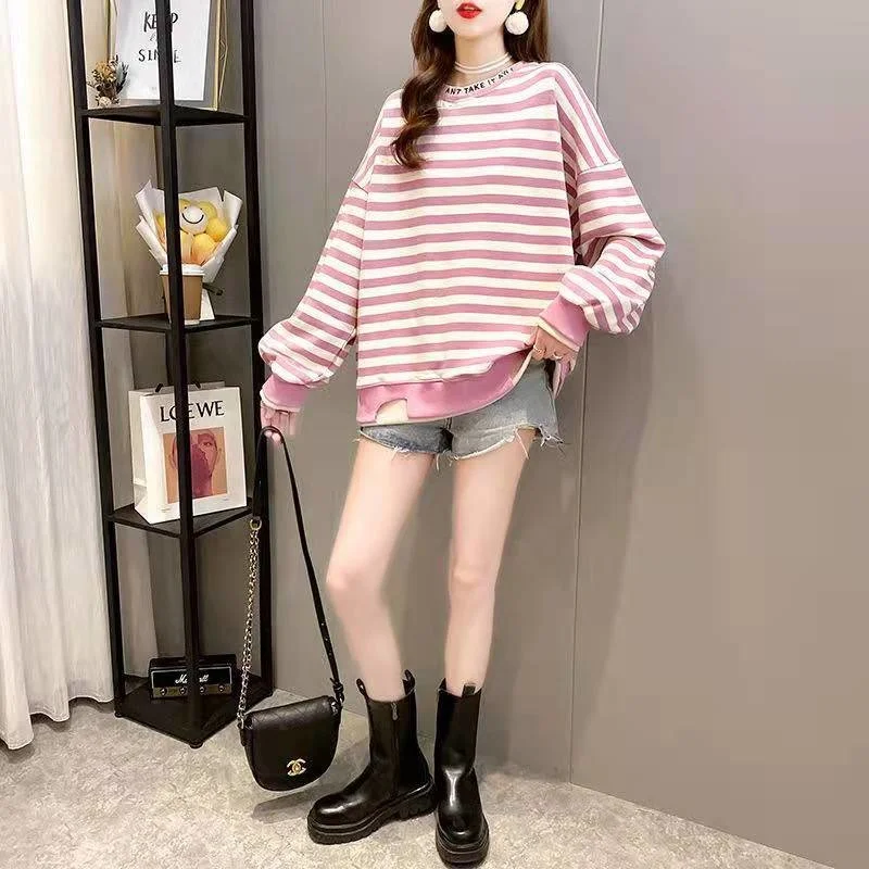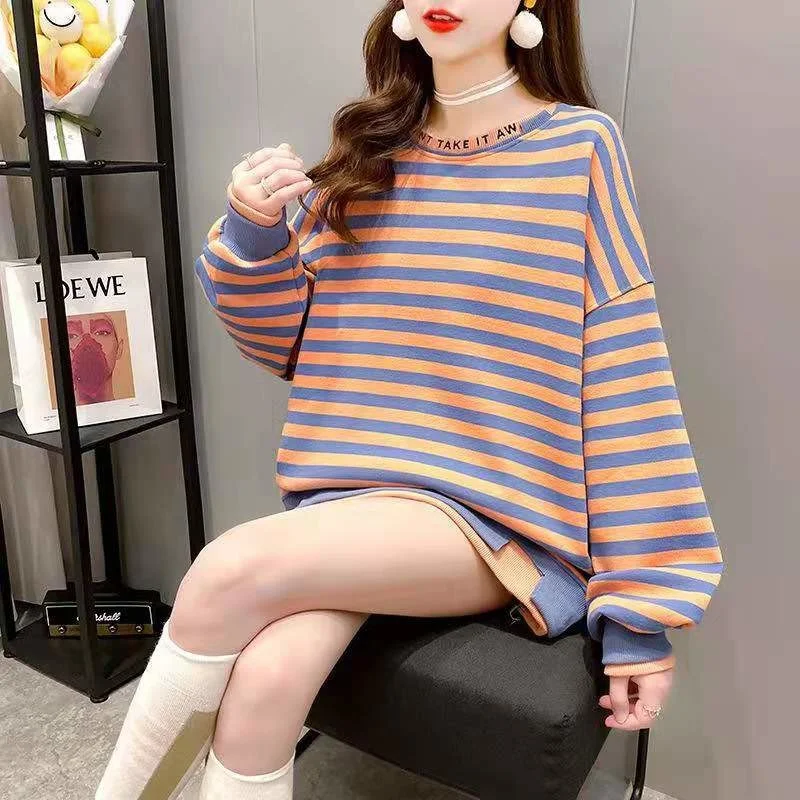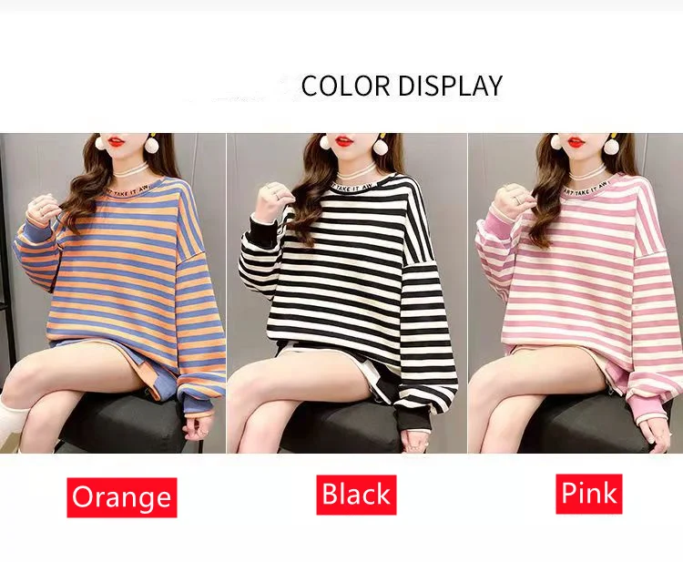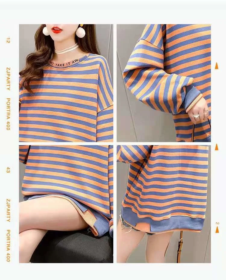 Отзывы о Корейский модный Полосатый пуловер толстовки Женский Топ с круглым вырезом и