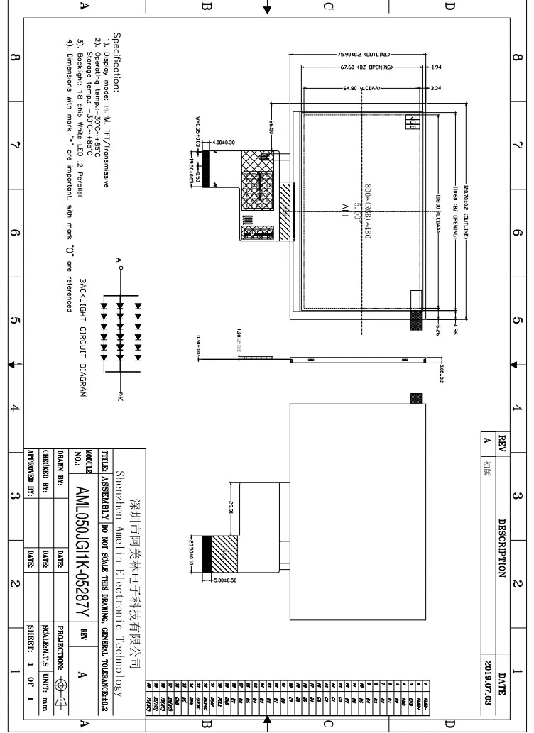 AML050JGI50-05287Это модуль TFT-LCD. Он состоит из TFT-LCD панели, драйвера