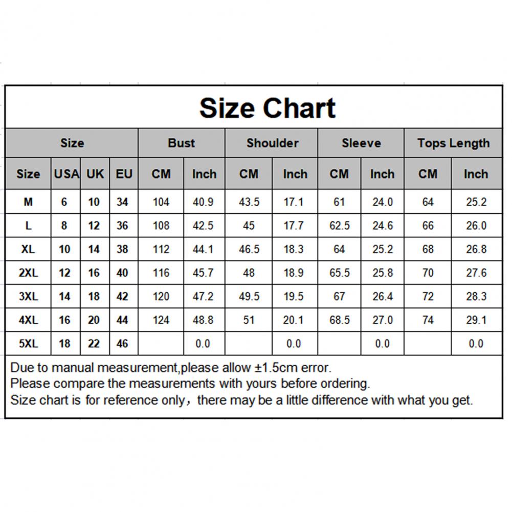 Размеры: 3XL, обхват груди: 120 см/46 ", плеча: 49,5 см/19,5", Длина: 72 см/28,3 "рукав: 67 см/26,4" (прибл.)