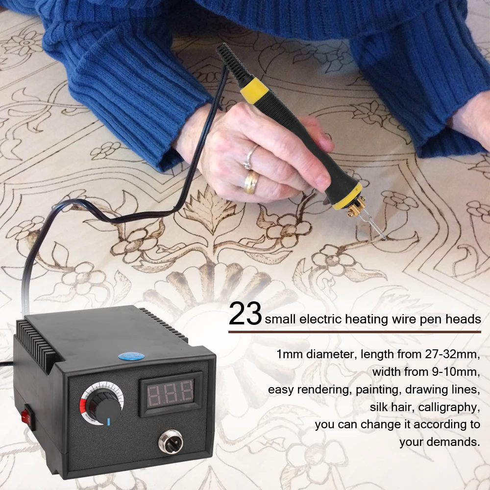 Это своего рода профессиональная пирографическая машина, с универсальной профессиональной тонкой нагревательной ручкой и 23 маленькими электрическими нагревательными головками. Соответствует инженерному дизайну ручки человека, компактный и легкий для стройных и гладких линий, вы можете создать красивую работу. Поставляется с 1-23 головками ручек, диаметром 1 мм, длиной от 27-32 мм, шириной от 9-10 мм, простой рендеринг, рисование, рисование линий, каллиграфия, вы можете изменить его в соответствии с вашими требованиями. Вы можете попробовать.