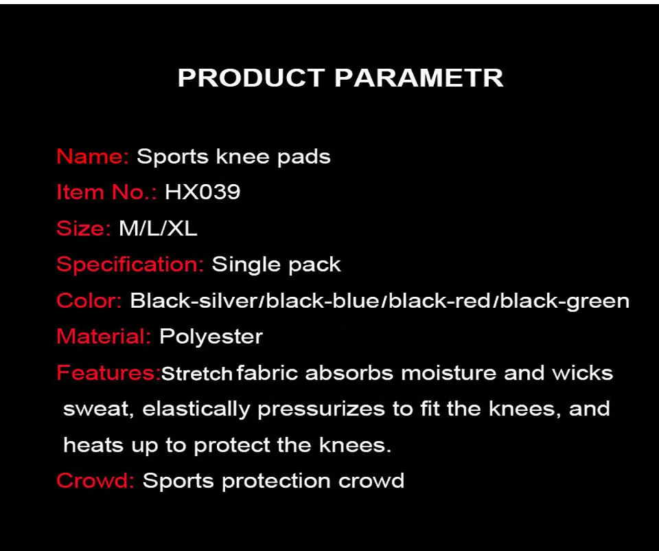 Характеристики: эластичная ткань впитывает влагу и впитывает пот, эластично удерживает колени и нагревается, защищая колени.
