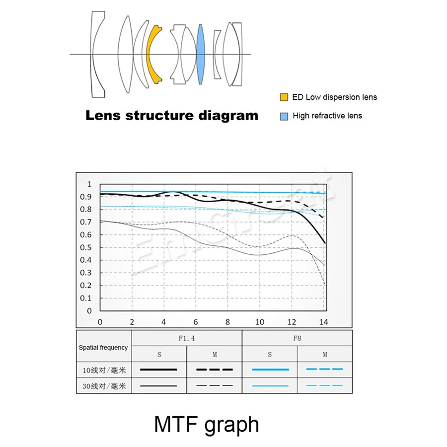 -Отличная оптическая конструкция: 11 элементов в 10 группах, включая 2 сверхнизких дисперсионных элемента и 2 линзы с высоким индексом преломления, которые могут эффективно подавлять разницу в цвете и контролировать сферические аберрации.