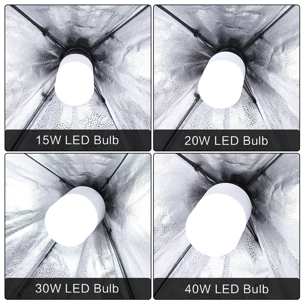 Лампа: 15 Вт, 20 Вт, 30 Вт, 40 Вт Светодиодный светильник (белый цвет);20 Вт кукурузная лампа (белый/желтый цвет);45 Вт, 135 Вт дневной светильник; 135 Вт двухцветная лампа. Все лампы имеют Цоколь E27, подходит для наших наборов мягких коробок E27.