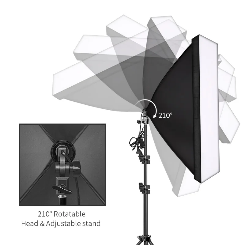 Большой гибкий софтбокс: 50*70 см/20*28 дюймов Большой софтбокс с белой диффузорной тканью обеспечивает вам идеальный ровный светильник; С E27 гнездом для прямой установки светодиодный светильник; И софтбокс может вращаться на 210 °, чтобы у вас был оптимальный светильник, делая ваши фотографии и видео более профессиональными.