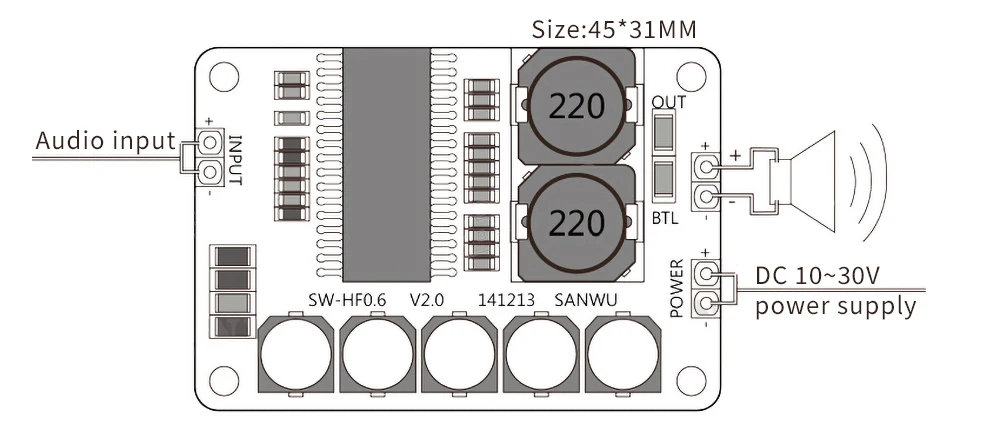 Эта плата использует высокопроизводительный чип TDA8932 с цифровым усилителем мощности, с небольшим размером, высокой эффективностью, высокой мощностью и пиковым значением может достигать 35 Вт. Качество звука хорошее, нет необходимости устанавливать дополнительный радиатор. Используя моно BTL схему, выход очень подходит для таких областей применения, как активная трансформация динамиков, осуществление электроакустической инженерии и исследования и разработки звуковых продуктов.