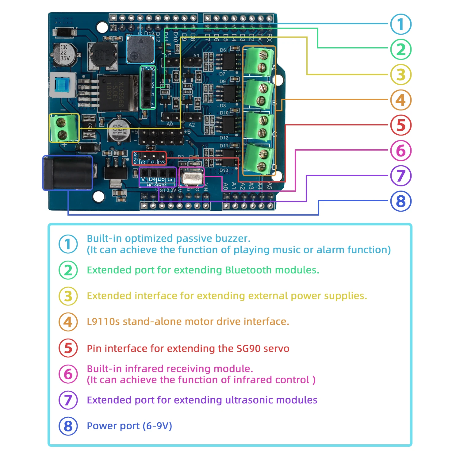 4. Adds a steering gear expansion interface and an integrated infrared remote control receiving module.