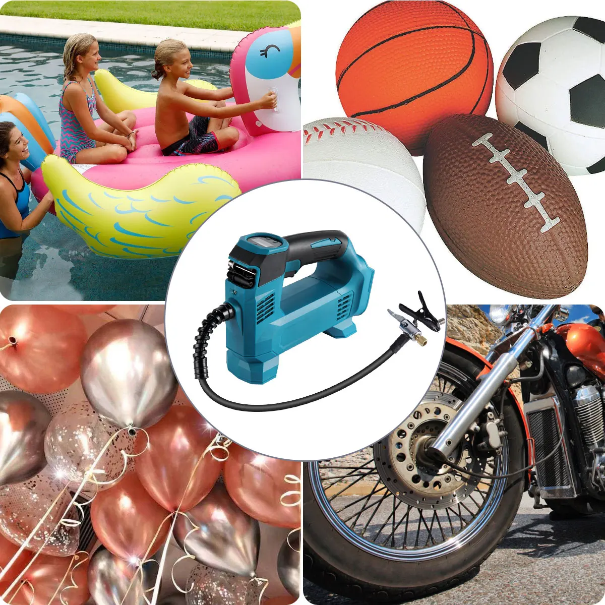 18V электрический воздушный насос портативный воздушный компрессор Цифровой Автомобильный шинный насос перезаряжаемый надувной насос для батареи Makita 18V Особенности: Цифровой манометр Высокая стабильность на земле Функция автоматической остановки при предварительно установленном целевом давлении Светодиодный светильник для работы Легкий и компактный дизайн Эргономичная мягкая ручка Встроенное хранилище для различных адаптеры для клапана Главный выключатель оснащен функцией автоматического отключения Встроенный термостат для защиты от перегрева Подходит для надувания велосипедных и автомобильных шин, спортивных мячей и надувного оборудования для отдыха Технические характеристики Спецификация: Объем воздушного разряда: 12 литров/мин Максимальное давление воздуха: 995 кПа (150 PSI) Тип батареи: литий-ионный Напряжение: 18 в Вес нетто: 1,1 кг Посылка включает в себя: (только корпус) 1 x адаптер клапана Presta 1 x игла для спортивного мяча 1 x конический адаптер