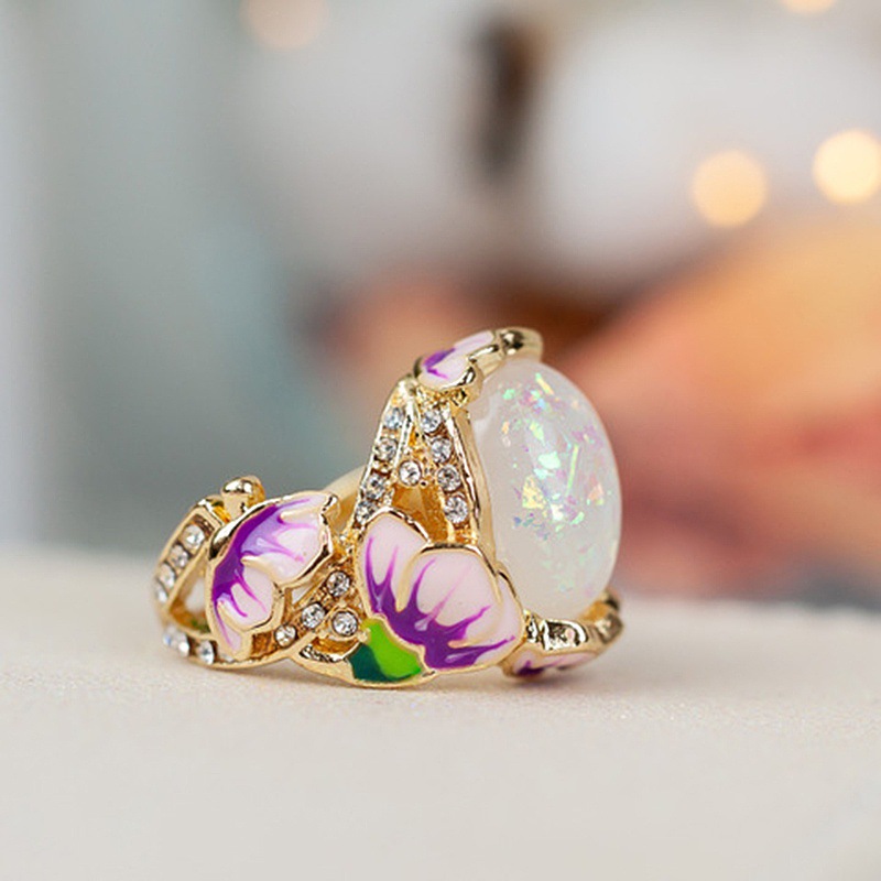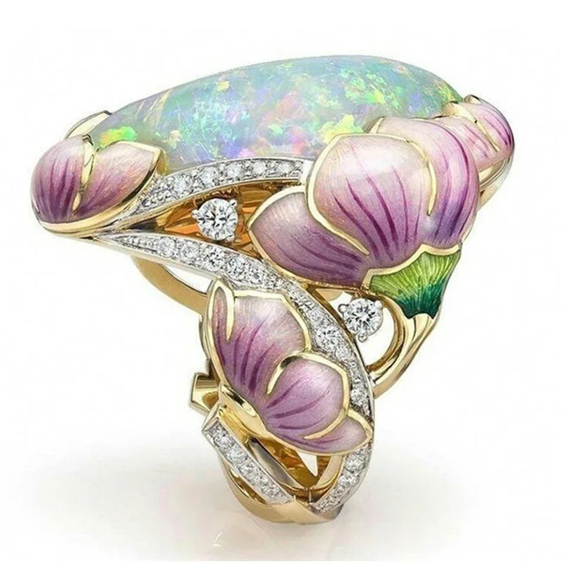 Купить Delicate Fashion Gold Filling Floral Ring Lavender Fuchsia Lotus Enamel Oval Cut Fire Stone Bridal Engagement Rings for Women |