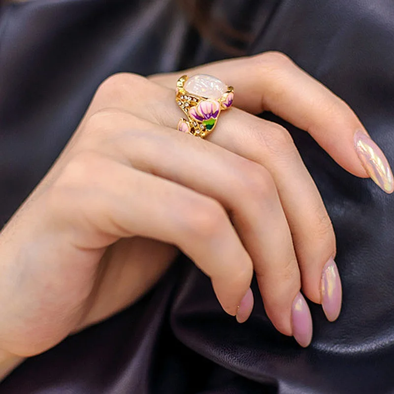 Кольцо с нежным дизайном золотой отделкой и эмалью в лавандово-фуксиевых тонах овальным огранкой драгоценного камня - идеальный выбор для невесты - купить