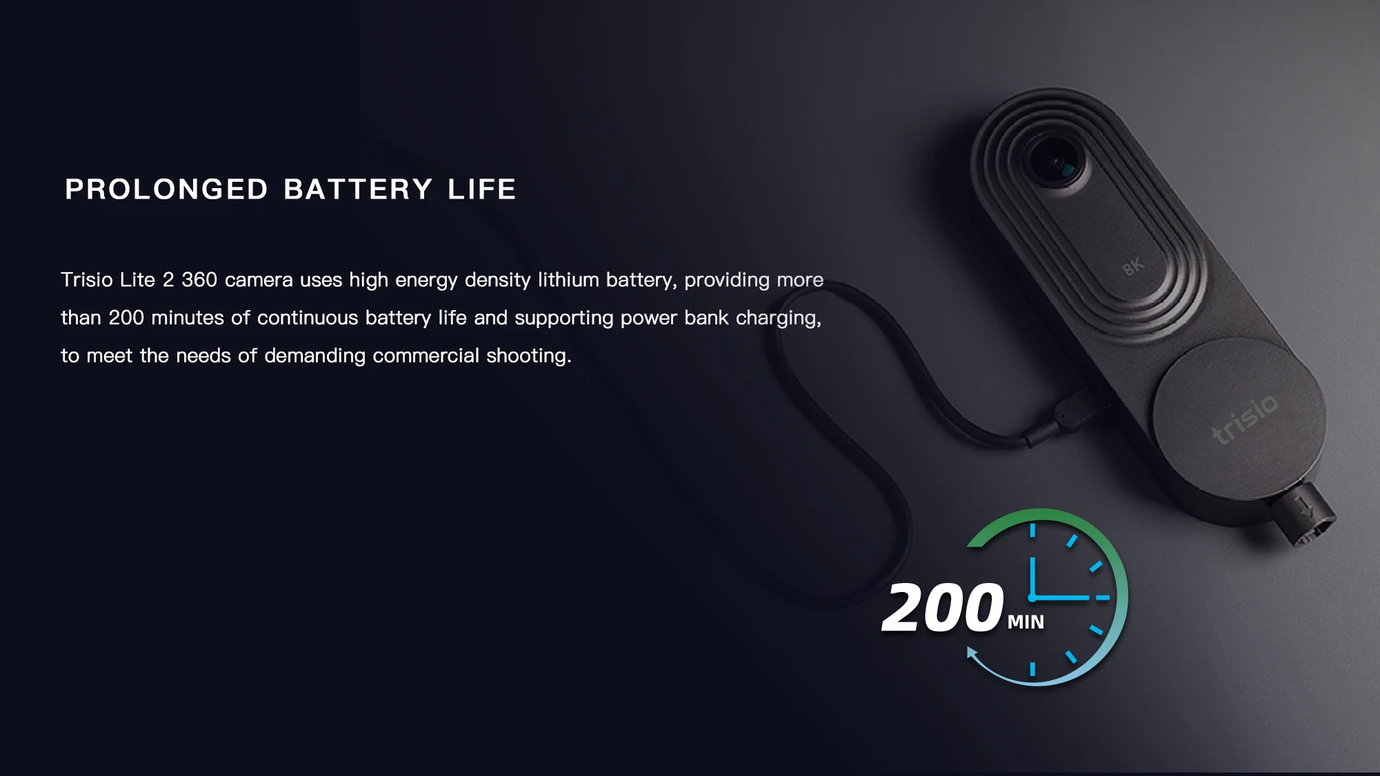 Камера Trisio Lite 2 360 использует литиевый аккумулятор с высокой плотностью энергии, обеспечивая более 200 минут непрерывного срока службы батареи и поддерживая зарядку банка питания, для удовлетворения потребностей требовательной коммерческой съемки.