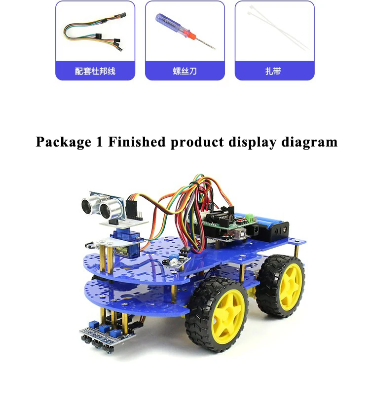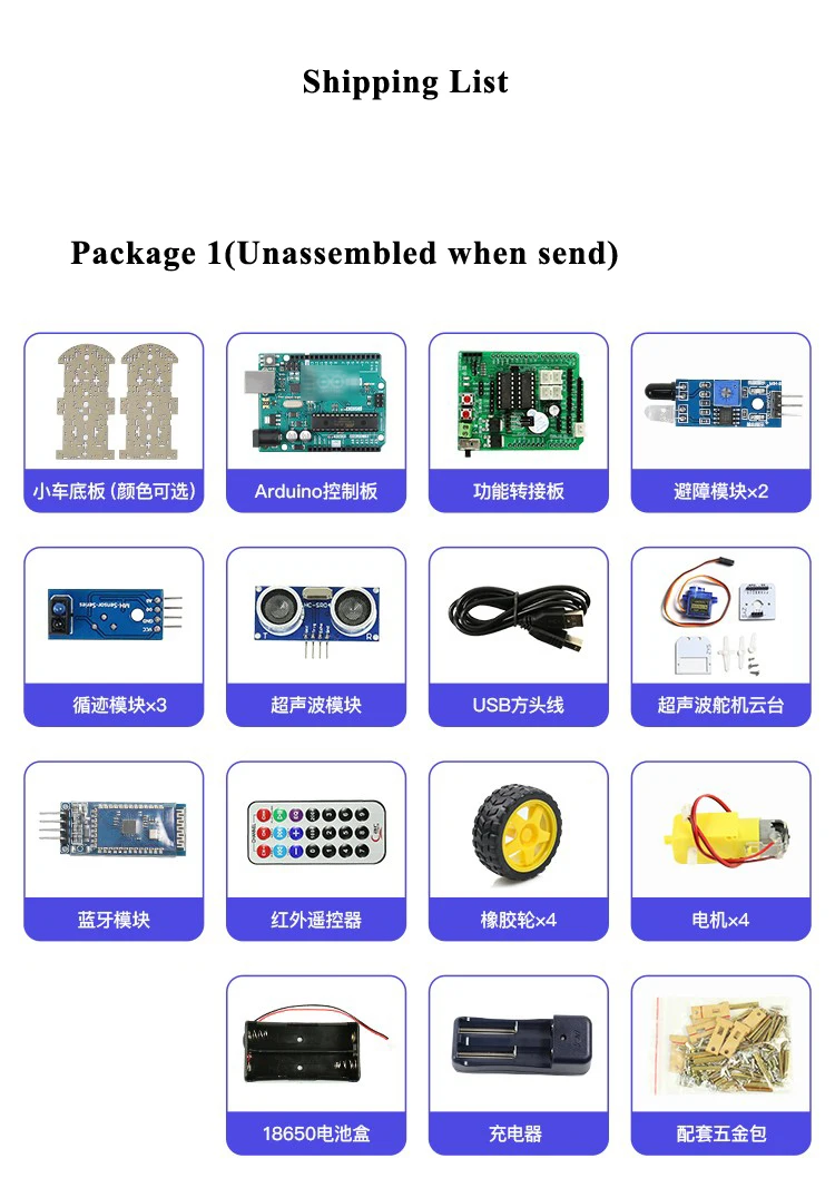 Ультразвуковая встряхивательная головка избегания препятствий: Рулевая Шестерня оснащена ультразвуковым поворотом для сканирования препятствий на 180 градусов вперед, и можно получить данные о расстоянии препятствий, который отправляется на расширительную доску для обработки, а затем движет умный автомобиль, чтобы повернуть.