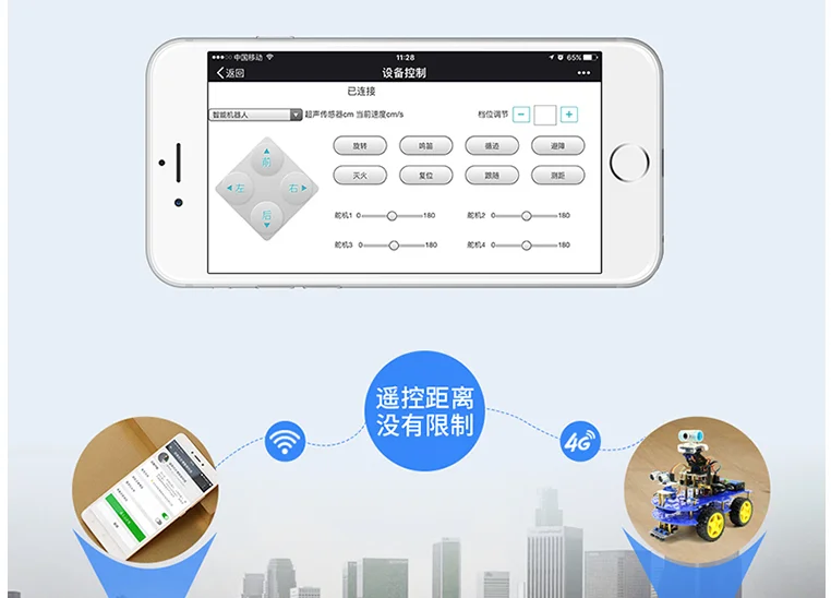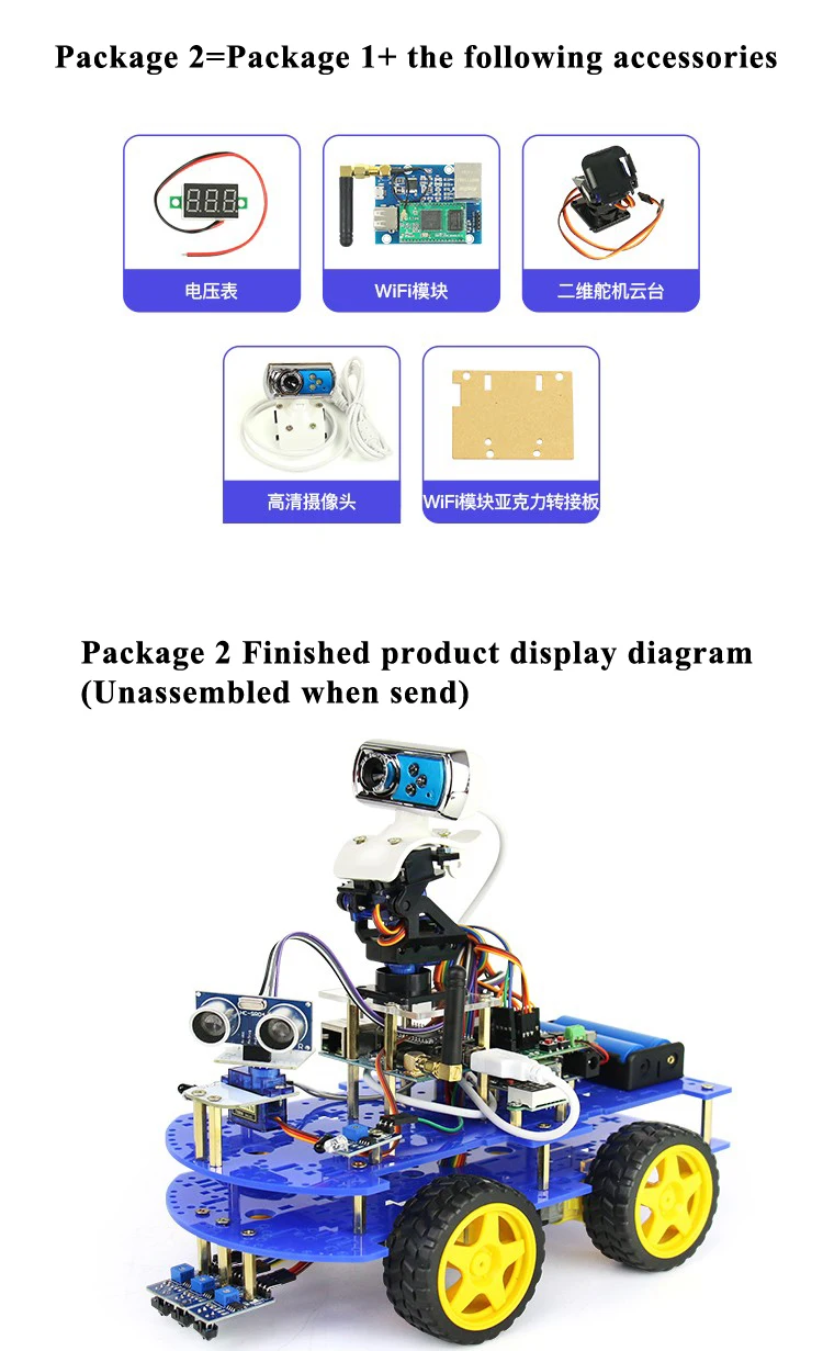 Поддерживающая камера робота + двухмерный наклон панорамирования и мобильный телефон APP реализуют управление Wi-Fi. Через WIFI вы можете отслеживать видео и управлять движением робота в режиме реального времени.