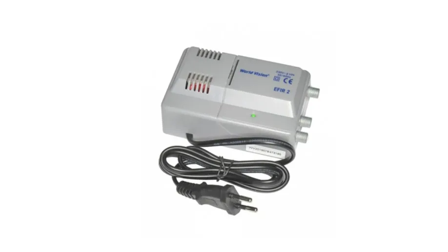 Усилитель World Vision Efir 2 - усилитель телевизионного сигнала с отдельной регулировкой по МВ и ДМВ диапазонам, имеет два выхода. Используется для усиления сигнала при делении на несколько телевизоров или для эфирной антенны за городом.