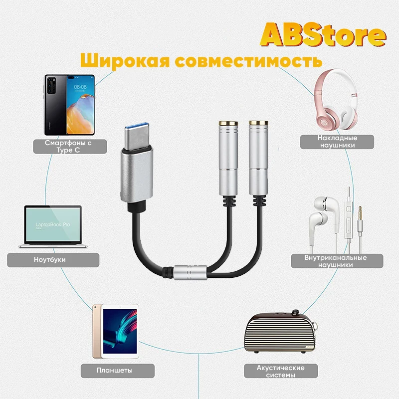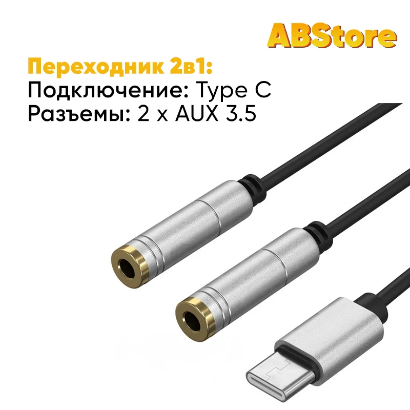 Кабель-адаптер с разъемом Type C-Two aux позволит подключить две пары наушников к разъему Type C на вашем устройстве. Компактный размер кабеля позволяет удобно носить его с собой, устройство не занимает много места.