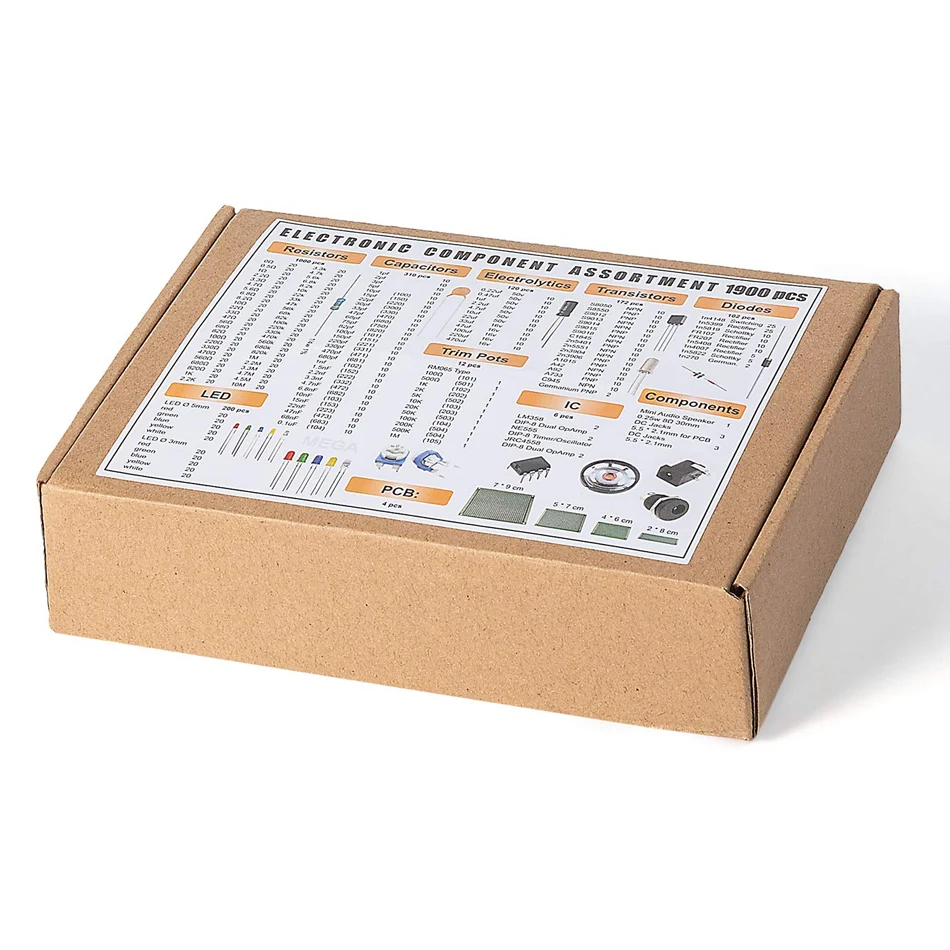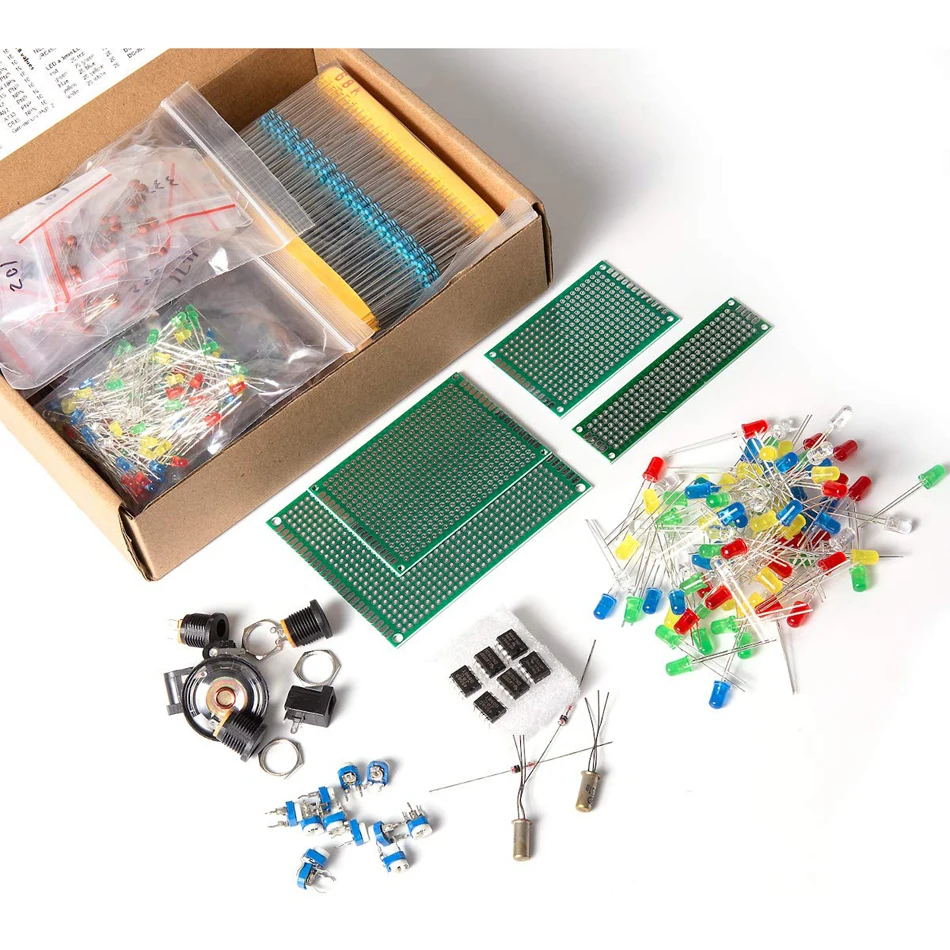 1000 шт. резистор, 180 шт. транзистор, 120 шт. электролитические конденсаторы, 100 ПК-диоды, 200 шт. 3 мм 5 мм светодиодный, 300 шт. керамические конденсаторы, 3 шт. DC-022 3 шт. DC-005 DC разъемы, 2 шт. LM358, 2 шт. NE555, 2 шт. JRC4558, 1 мини-динамик, 2 шт. 1n270 германиевый диод, 2 шт. германиевый транзистор, 12 шт. Обрезной потенциометр, 4 шт. PCB