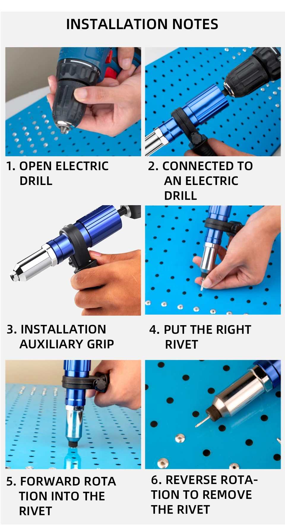 Примечание:1. При использовании адаптера с заклепками вам нужно держать переднюю ручку, чтобы нормально работать.2. Заклепки выше M5 * 20/3,2*20/2,4*20 не могут быть использованы.3. Заклепки из нержавеющей стали не могут быть использованы.4. Если вы не выполните процедуру, гвоздь будет застревать или гвоздь не может быть вытянут.5. Если заклепка не может быть удалена, Открутите головку розетки и нажмите на нее с помощью гаечного ключа, чтобы вытащить ее.Если у вас возникнут какие-либо проблемы, пожалуйста, своевременно обратитесь в службу поддержки клиентов.