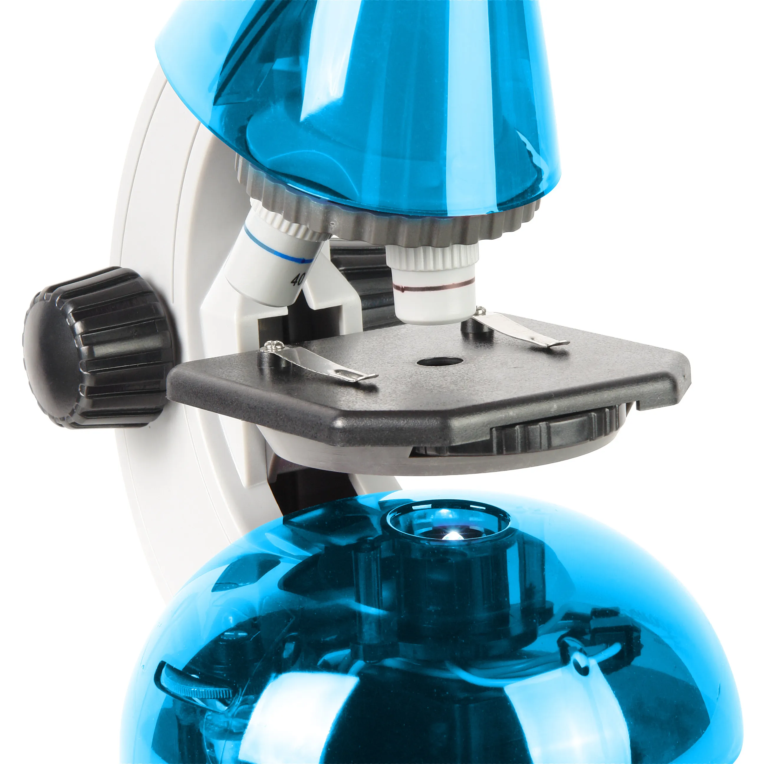Фокусировка – регулирование расстояния между объективом и предметным столиком, чтобы микропрепарат был виден максимально четко – выполняется с помощью больших удобных маховиков. Настроенная резкость не сбивается самопроизвольно или из-за случайного движения ребенка, изображение остается чистым и контрастным.