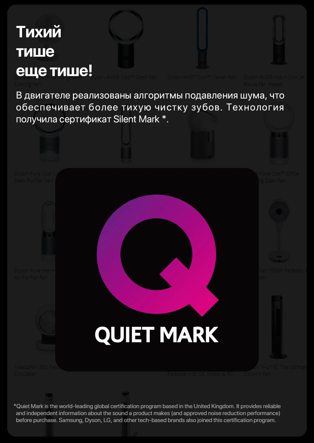 Двигатель в сочетании с алгоритмами подавления шума дает более тихий опыт чистки. Технология была сертифицирована тихим Марком *
