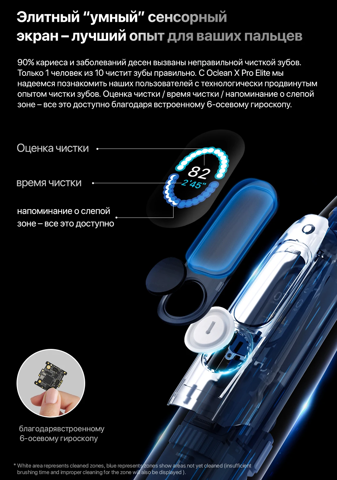 90% полостей и заболеваний десен вызваны неправильной чисткой. Только 1 в 10 человек чистят правильно. С Oclean X Pro Elite, мы надеемся просветить пользователя с технологически передовым опытом чистки.
