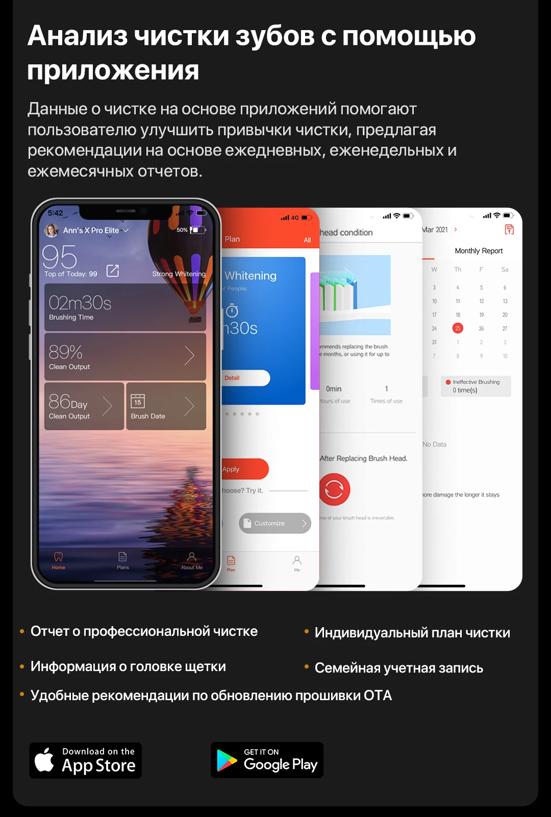 • Приложение предоставляет аналитические отчеты о чистке и может нажимать пользовательские режимы на зубную щетку