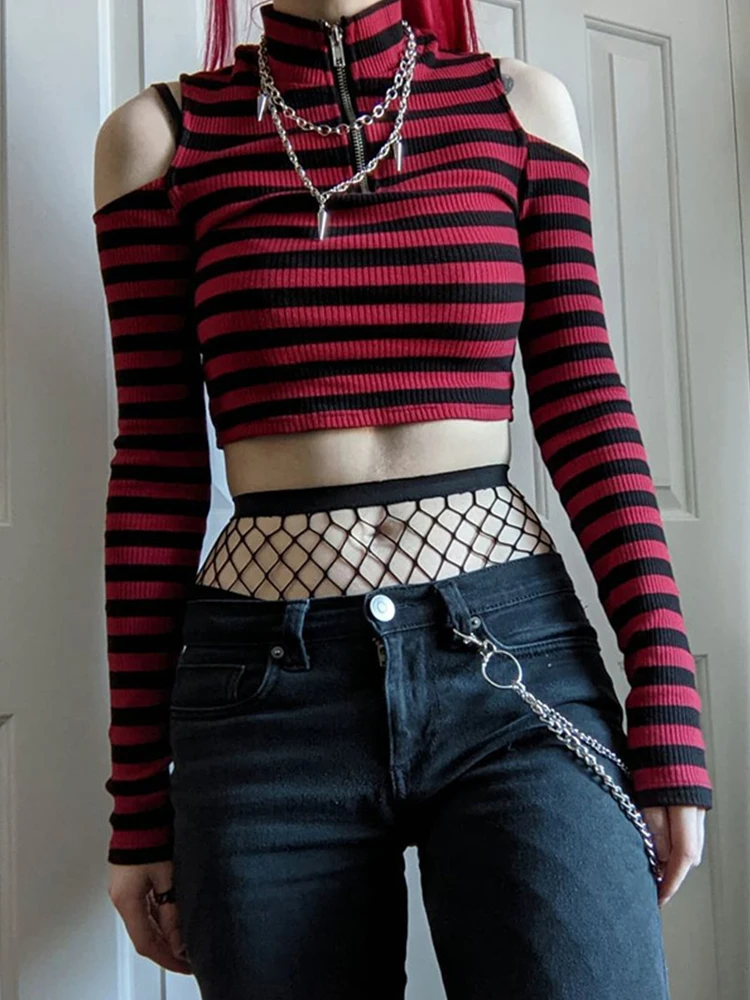 Купить Женская футболка на молнии в полоску с открытыми плечами и длинным рукавом |