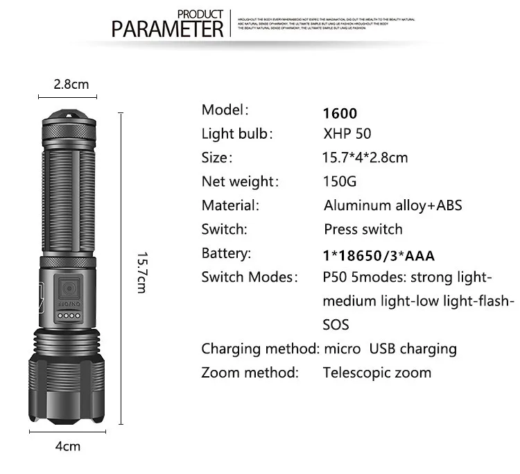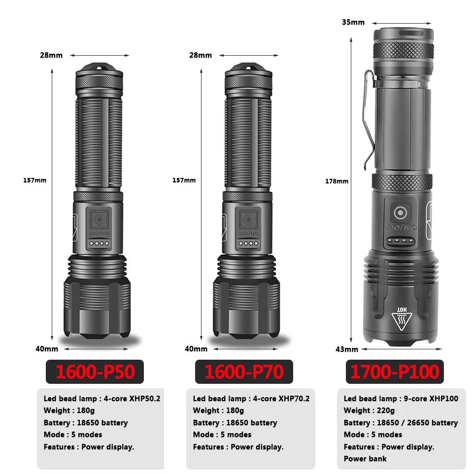 Посылка включает:A: 1 * Фонарик, 1 * USB кабель (Примечание: без аккумулятора)B: 1 * Фонарик, 1 * USB кабель, 1 * АккумуляторC: 1 * фонарик, 1 * USB кабель, 1 * аккумулятор, 1 * USB зарядное устройство, 1 * USB Автомобильное зарядное устройство, 1 * Подарочная коробкаО режиме батареи:XHP50 и XHP70 isАккумулятор 18650. XHP100 isАккумулятор 26650