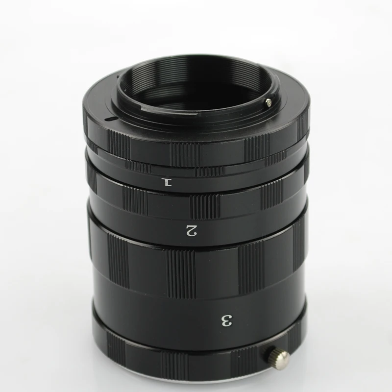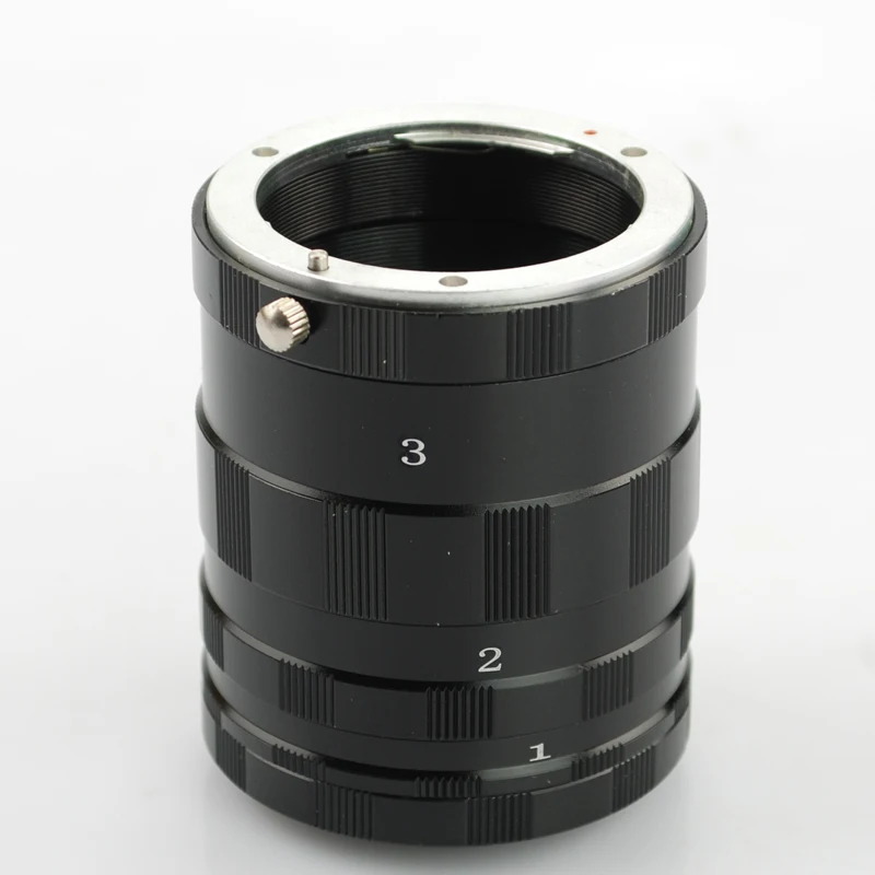 Этот набор удлинительных трубок обеспечивает 3 удлинительных трубки, которые могут быть добавлены между камерой и объективом, чтобы сделать фокусировку объектива на более близком расстоянии и увеличить его. Удлинительные трубки-это металлические трубки с креплением на заднюю линзу на одном конце и креплением на корпус камеры на другом конце.
