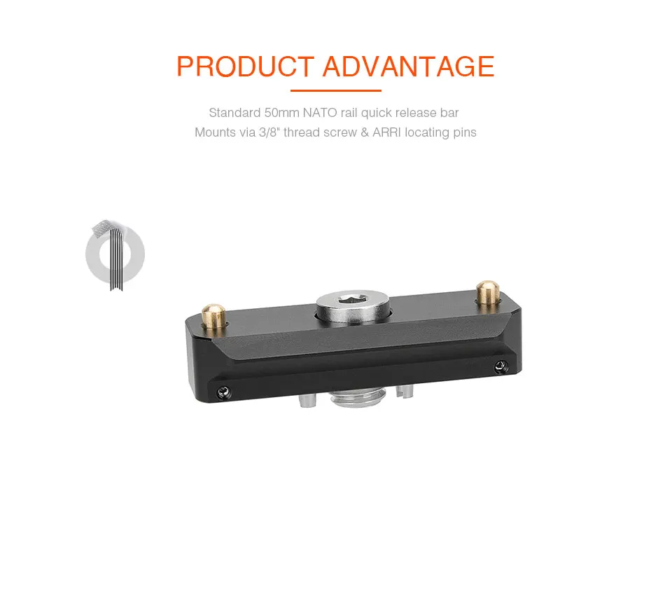 • HDRIG 50 мм стандартная безопасная рейка NATO может быть прикреплена через 3/8 "-16 резьбовых винтов с контактами ARRI и обеспечивает рельсы NATO для внешних аксессуаров при быстросъемном использовании.