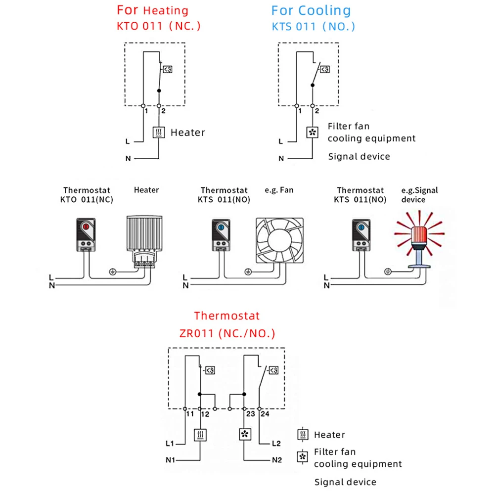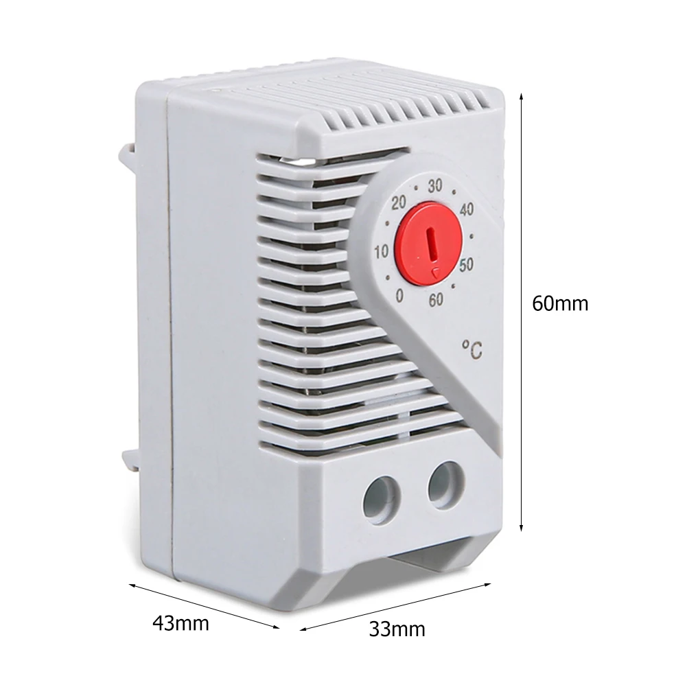 ![]() KTO011/KTS011/ZR011 0-60 Degree Cabinet Mechanical Temperature Controller Normally Open / Closed Compact Thermostat Thermoregulator for Heating Cooling Feature: The thermostat shell is made of high-quality plastic material, with fine workmanship, environmental protection, safety, and durability. Its temperature control range is from 0° to 60°, which is very suitable for controlling heaters, filter fans, cooling equipment and other signal equipment in homes, markets, etc. Large data scale, adjustable buttons, easy and convenient to adjust and control the temperature, the color of the thermostat button (red/blue) is your choice. It adopts standard guide rail clamp design, 4 feet seat, easy to install and disassemble. The circuit interface at the bottom of the thermostat can make the wiring firmer and safer. Specification: Switch temperature difference: 7K (±4K tolerance) Sensor element: Constant temperature bimetal Contact type: Snap-action contact Service life:> 100,000 cycles Wiring mode: 2 terminals, maximum clamping torque 0.5Nm: hard wire 2.5mm²; stranded wire (with wire end ferrule) 1.5mm² Installation: Clamp for 35mm DIN rail, EN60715 (or EF 118 series for outlet filter) Shell: Plastic conforms to UL94 V-0, light gray Operating/storage temperature: -45 to +80°C (-49 to +176°F) Operating/storage humidity: Maximum. 90% RH (non-condensing) Protection class: IP20 Button color: Red, Blue, Red + Blue Note: Due to the different monitor and light effect, the actual color of the item might be slightly different from the color showed on the pictures. Thank you! Please allow 1-2cm measuring deviation due to manual measurement. ![]() 1 X Temperature Controller