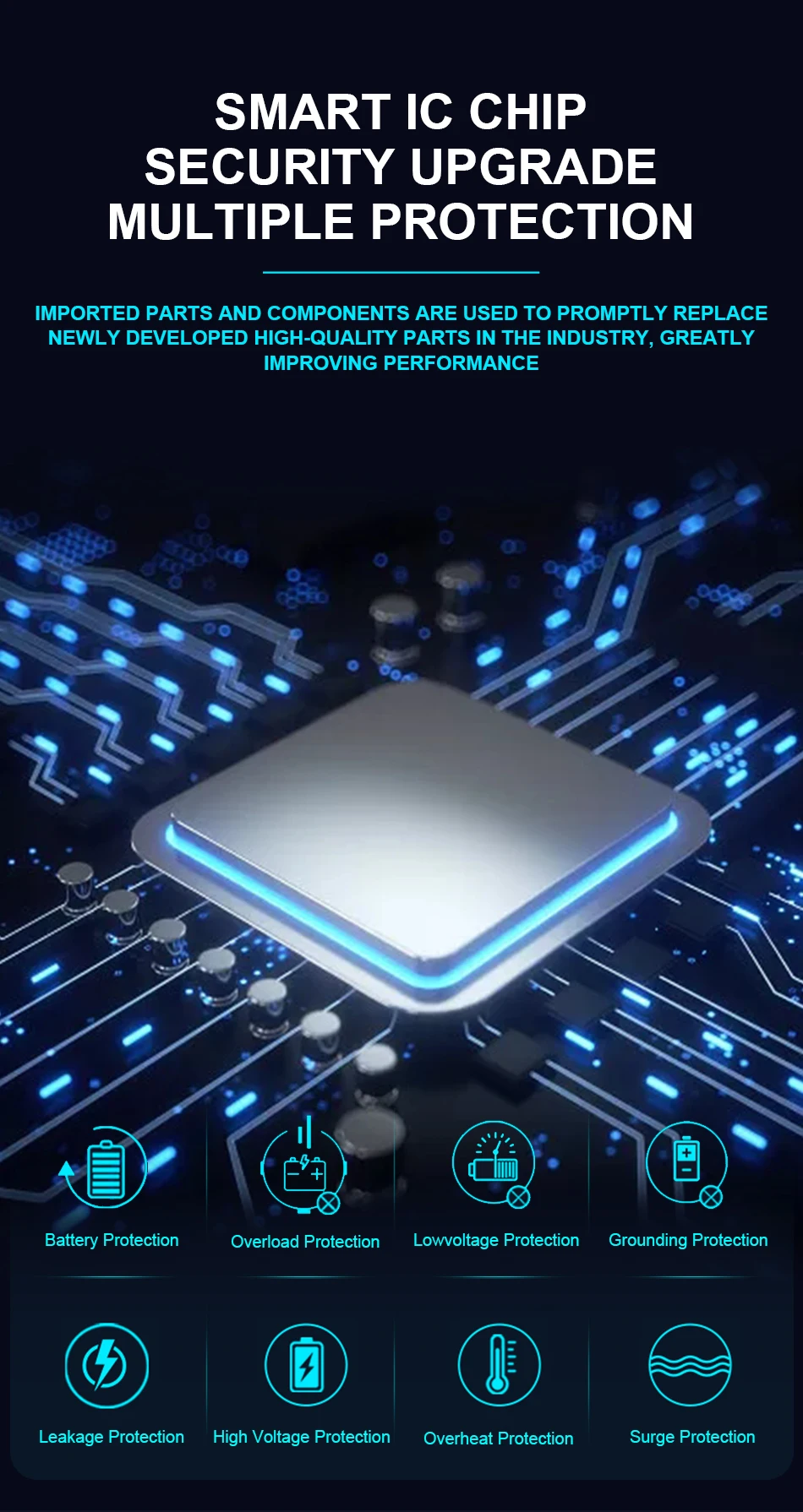 8 интеллектуальная защита, защита от перегрузки, защита от высокого напряжения, защита от низкого напряжения, защита от перегрева, защита от обратной полярности, защита от короткого замыкания, защита от перегрузки по току, Страховая защита
