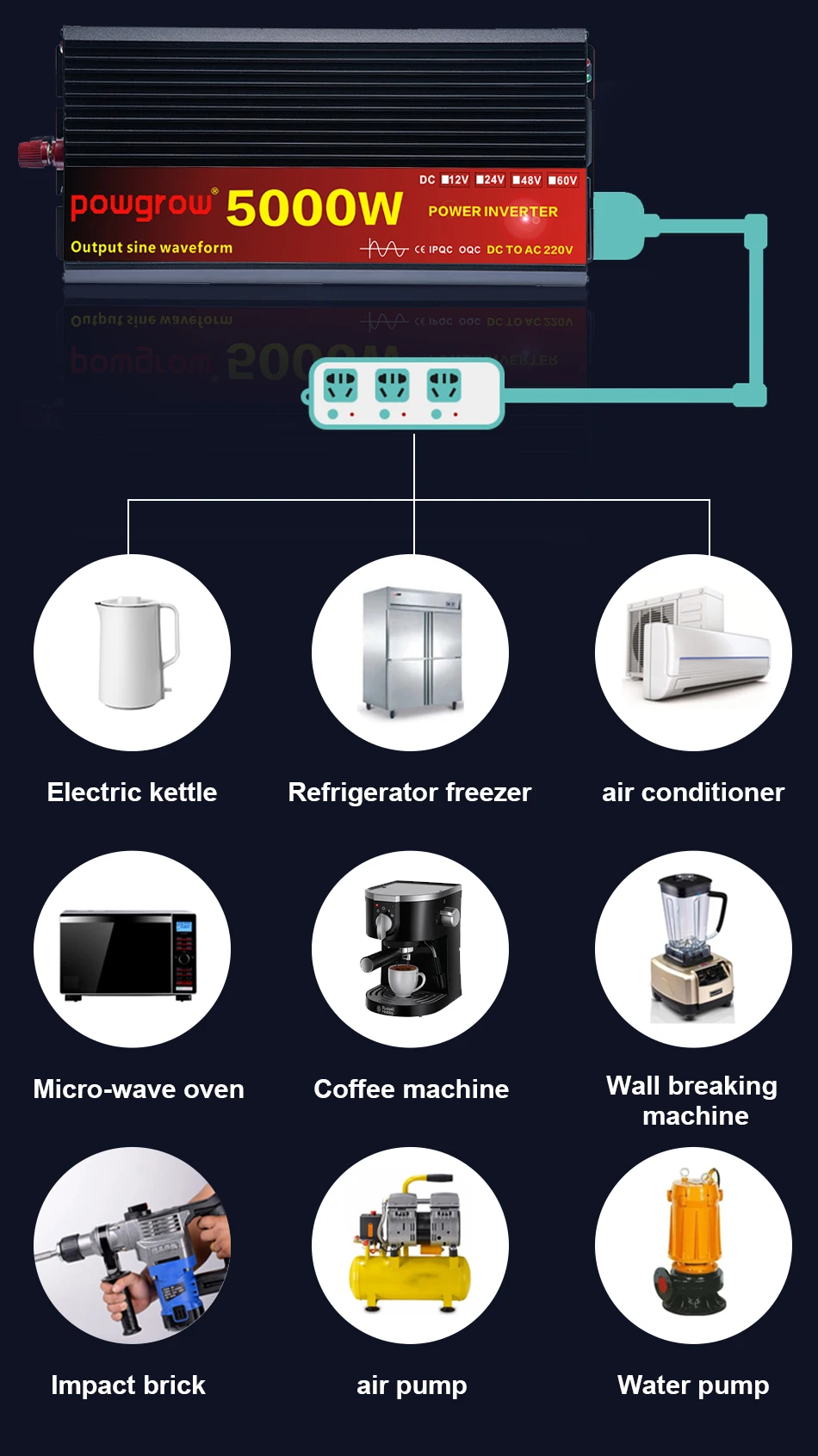 С пиковой мощностью 2000 Вт/3000 Вт/4000 Вт/5000 Вт.