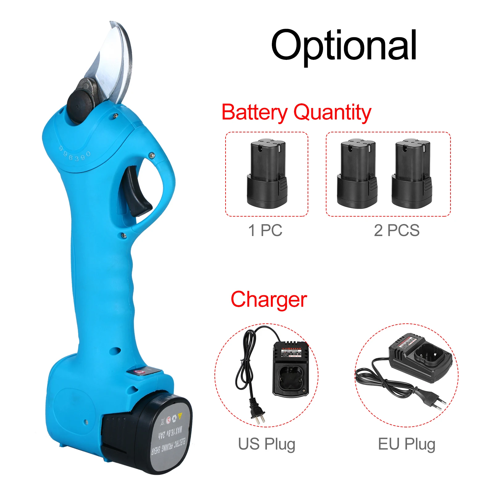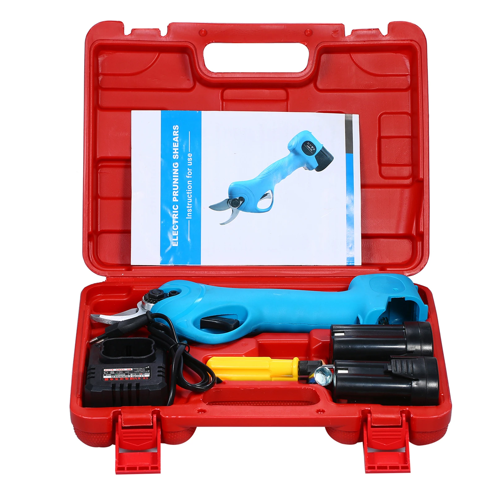 This product is a battery-driven electric pruning shear, comprises a fixed blade, a movable blade, lithium battery, battery charger, tool box and other components. Designed for cutting or trimming or less branches in gardens, parks, fruit orchards, vineyards, greenhouses, etc. Simple and convenient to operate, it's also more efficient than traditional manual pruners.
