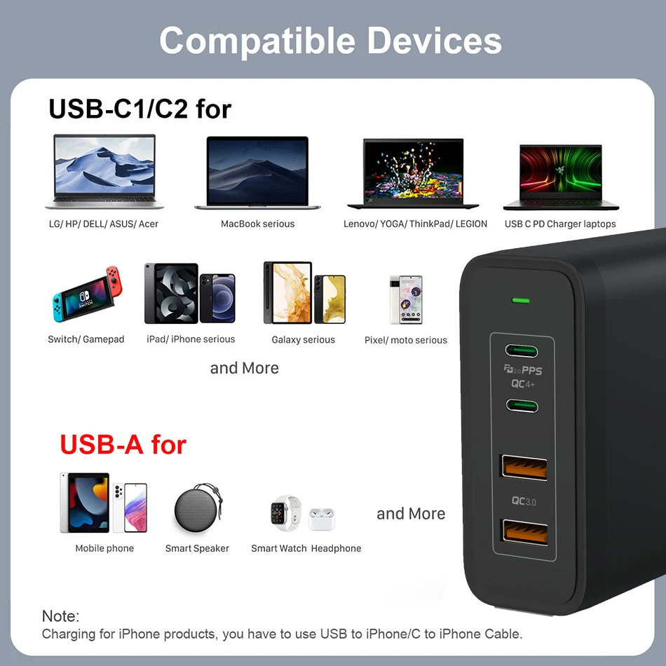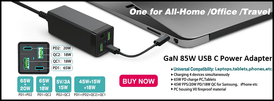 USB-C1 и C2 выход: 100 Вт макс (PPS: 3,3-20 в/5A; 5 В/3A, 9 В/3A,12 В/3A,15 в/3A, 20V/5A)