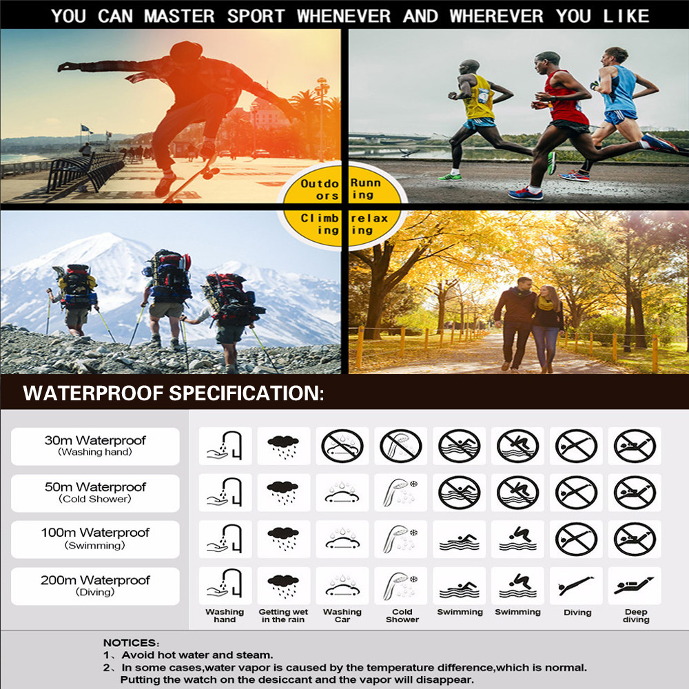 Вода Устойчивость: 5 АТМ, также для душа, плавания и <50 м дайвинга. (Пожалуйста, не нажимайте Любой ключ под водой)