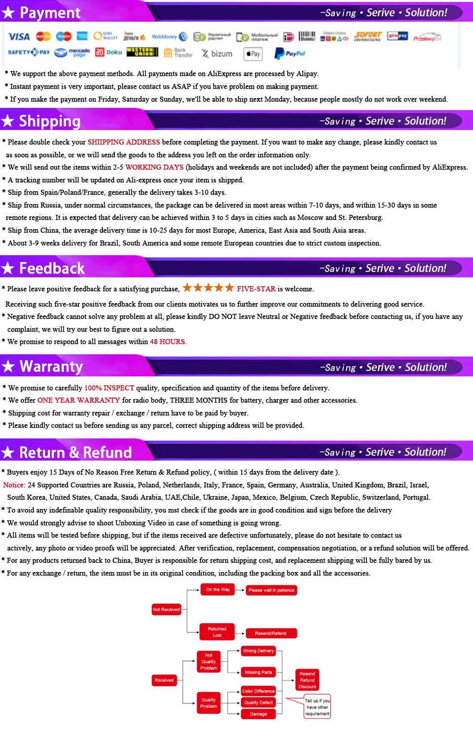 Частота: 400-469,995 МГц 16 каналов Литий-ионный аккумулятор 1500 мАч 50 CTCSS/105 CDCSS Функция VOX Голосовая подсказка Программирование ПК Аварийная сигнализация Интеллектуальная Зарядка Экономия батареи Оповещение о низком напряжении Таймер отключения времени Фонарик |