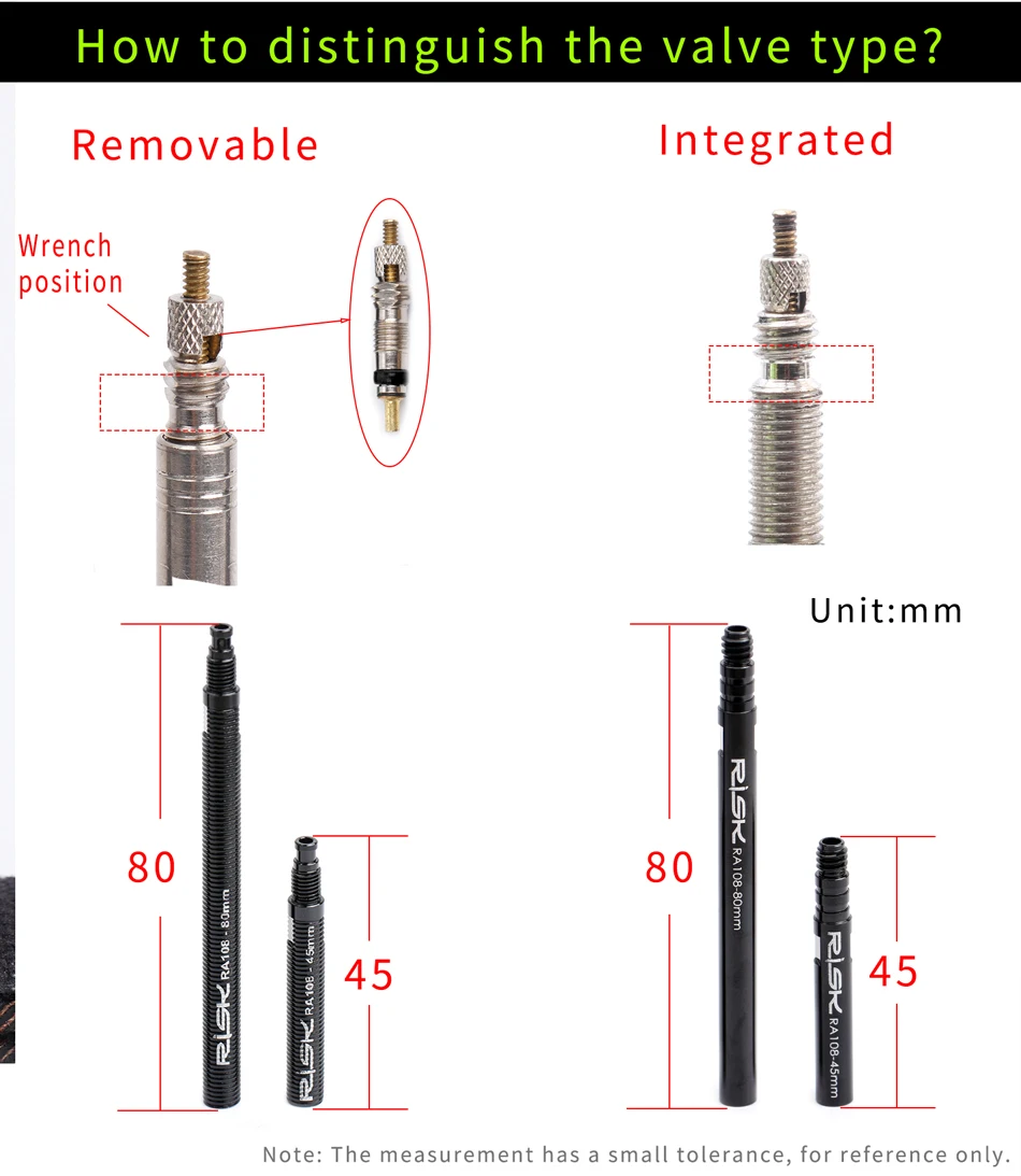 Название: RISK Presta Vavle Extender бренд: RISK Материал: алюминий aly Использование: Extension presta vave Размер 1:Integrated-45mm/80 мм Размер 2:Removable-45mm/80 мм вес 1:Integrated-45mm 1 комплект 10,47 г вес 2: integrated-80mm 1 комплект 16,15 г Вес 3:Removable-45mm 1 комплект 7,2 г Вес 4:Removable-80mm 1 комплект 10 г Вес 5: Съемный клапан Presta уплотнительное кольцо 100 шт./упаковка 2,54 г посылка: пластиковая коробка
