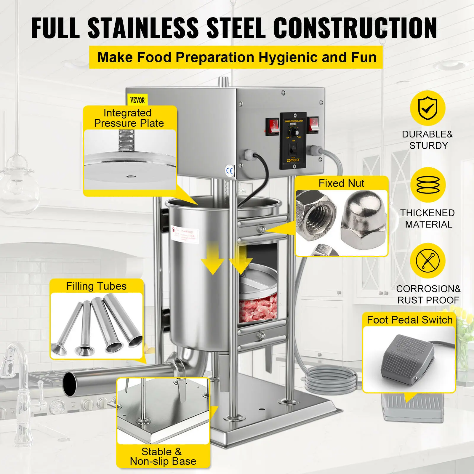 Большая емкость и простота очистки: эта вертикальная колбасная машина оснащена цилиндром из нержавеющей стали с емкостью 15 литров/24,3 фунтов, который может держать большое количество мяса и экономить ваше рабочее время. Съемный дизайн удобен для чистки.