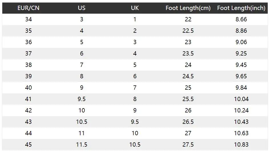 Может быть разница в 5 мм между длиной обуви и внутренней длиной. Пожалуйста, внимательно прочитайте таблицу размеров или выберите больший размер перед покупкой. Мы рекомендуем клиентам выбратьДлина стопы + 1 см = длина стельки.