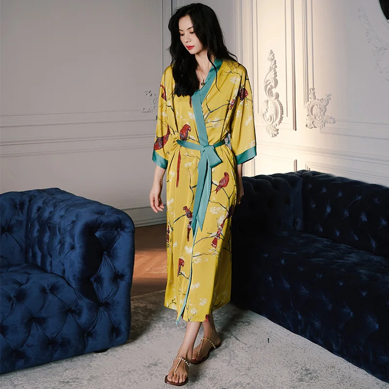 Отзывы о Халат-кимоно Женский атласный с принтом птиц желтый халат ночная рубашка пижама