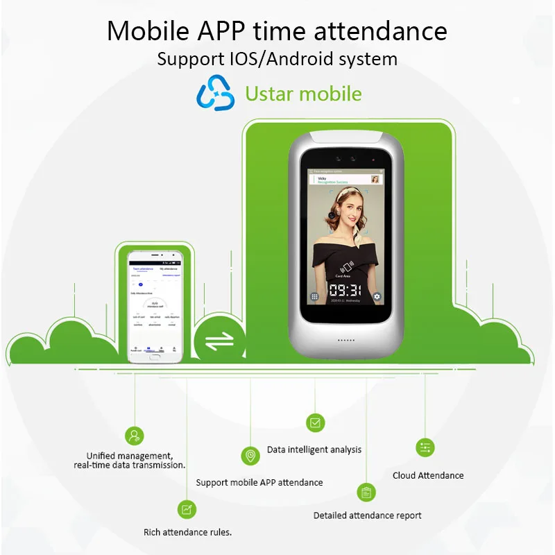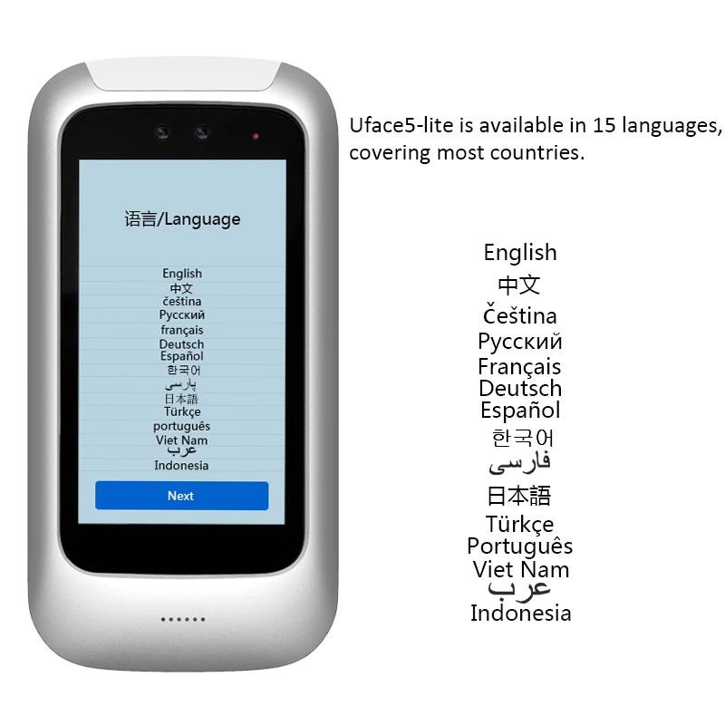 Uface5-lite может переключаться на 15 языков, пожалуйста, будьте уверены в покупке и использовании.Характеристики:МOdel: Uface 5-LiteПрименение: мобильный телефон UstarПрограммное обеспечение: облако, LANДисплей экран: 5 дюймов емкостный сенсорный экранИнтерфейсы: релейный выход, выход Wiegand, входной сигналПереключатель Tamper, модуль карты, доступ USB, считыватель qr-кодаРежим связи: RJ45, Wi-Fi, TCP/IPТочность: до 99.99%Ёмкость: 3000 части уход за кожей лица изображенияТип картридера: Стандартная карта MIFAREЗаписи: 30 тысяч записей о распознаванииДальность распознавания: Live обнаружения: 0,3-1,5 м; Non-live: 0,3-3 мПроцессор: Двухъядерный ARM Cortex-A7 @ 900 МГцРабочая температура:-10 °C ~ 60 °CТемпература хранения:-20 °C ~ 60 °CРабочая влажность: 10% ~ 90%Мощность: 12 В/2 а постоянного токаПотребляемая мощность: Макс. 15 Вт