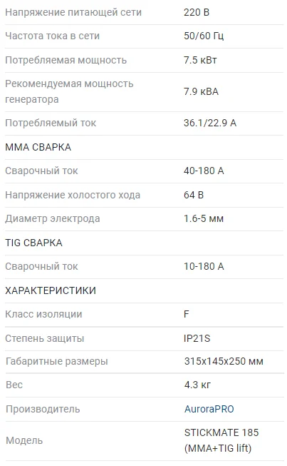 Отзывы о Сварочный инвертор AuroraPRO STICKMATE 185 (MMA+TIG lift)