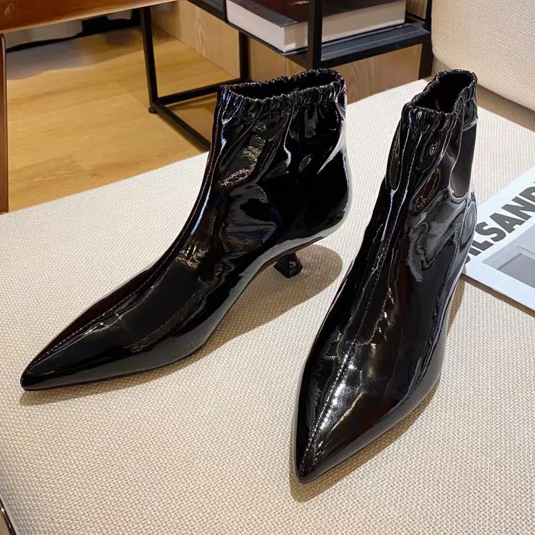 Отзывы о Ботинки женские из лакированной кожи заостренный носок низкий каблук Однотонные