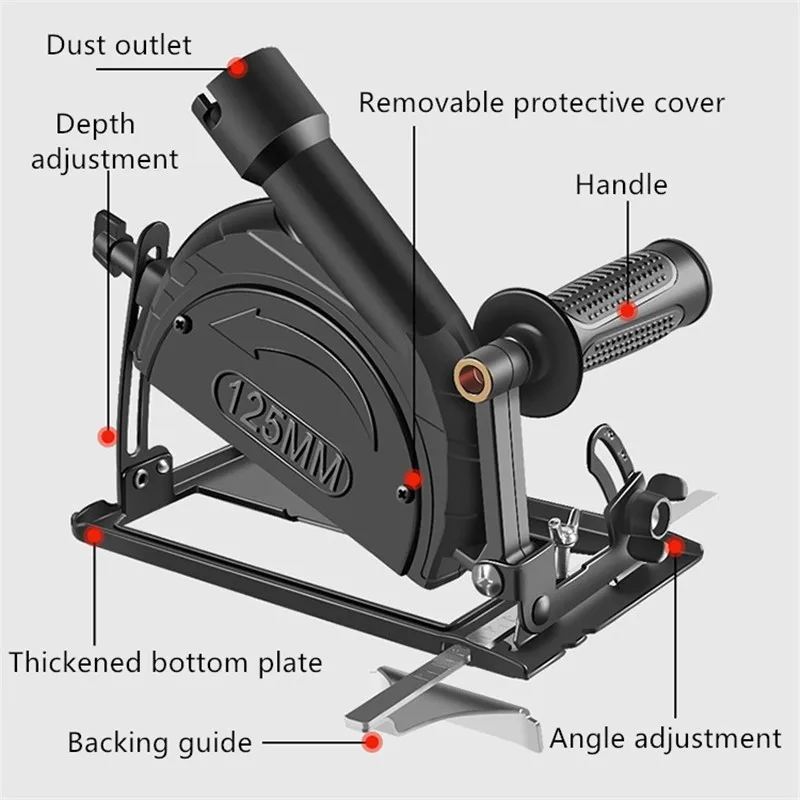 Material: metal + plasticAngle range: adjustable 0-45 °Applicable saw blade diameter: Within 125mmCutting depth: 0 ~ 40mmApplicable model: 100~125mm angle grinderPackage Included:1 * Base bracket(The angle grinder and saw blade shown in the picture are not included)