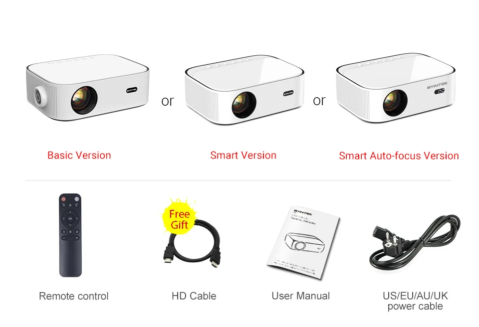 Список посылка:1 шт. * Проектор1 шт. * Кабель Питания1 шт. * пульт дистанционного управления1 шт. * Руководство пользователя1 шт. * HD кабель (бесплатный подарок)