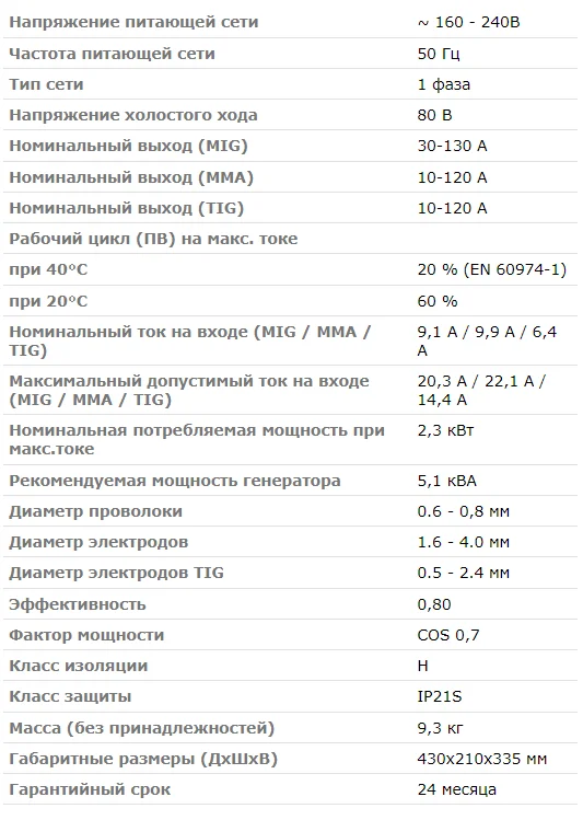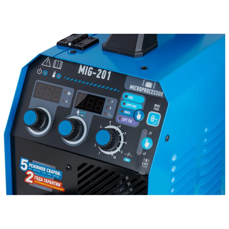 - 5 в 1 (MIG / SPOT MIG / FLUX / MMA / TIG lift DC);