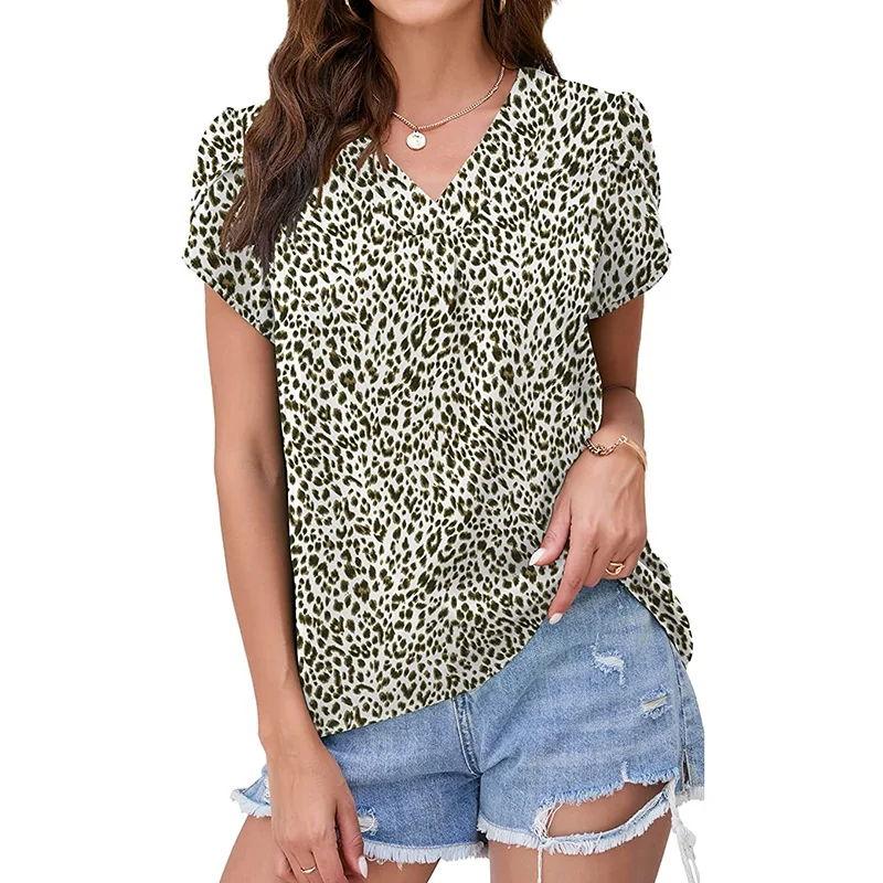 Женская блузка с коротким рукавом леопардовым принтом и V-образным вырезом - - купить