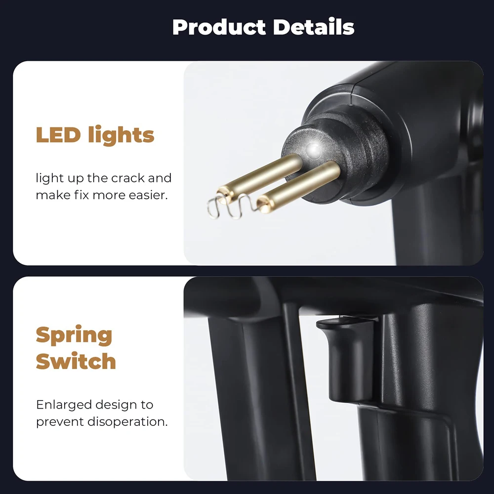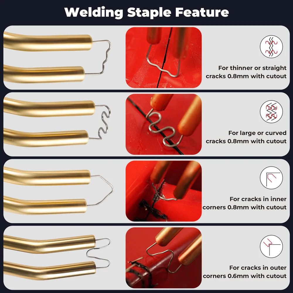 【Быстрая работа 】-пластиковый сварочный набор выберите правильный штапель, вставьте в латунный держатель, нажмите кнопку питания, подождите несколько секунд, и пусть штапель плавится в пластиковые детали медленно, чехол с крестиком через пластиковую доску.