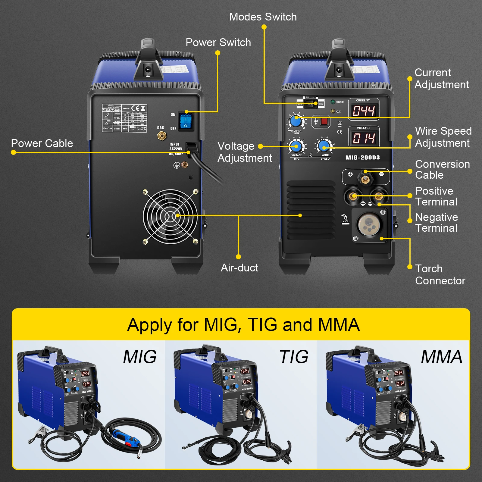 Панель сварщика проста и удобна в эксплуатации. Три режима можно легко Переключить: MIG, MMA, TIG. Скорость подачи проволоки, сварочный ток и напряжение регулируются. Вы можете настроить в соответствии с вашим приложением и различными толщинами машин.