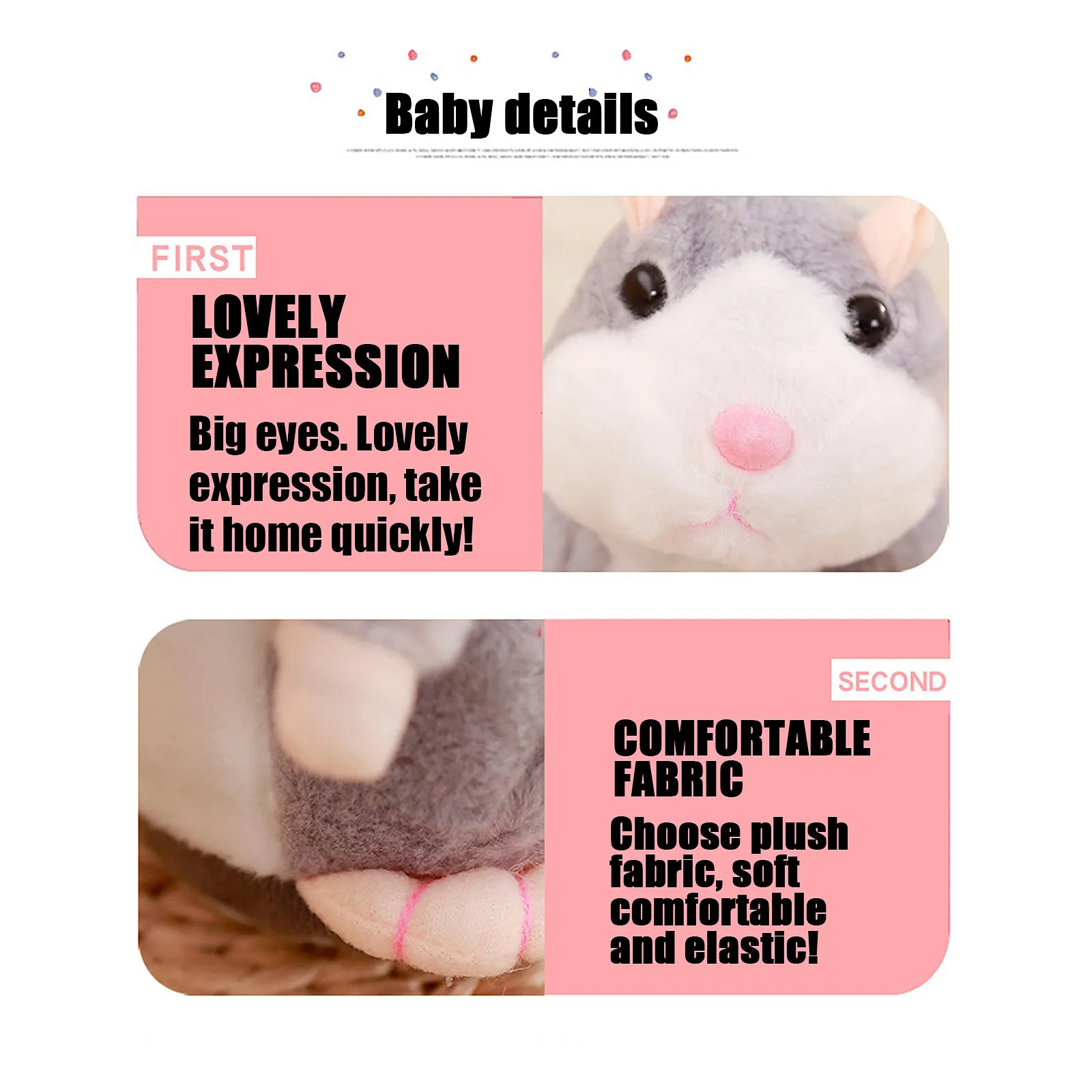Мягкая Плюшевая поверхность и Хлопковая ткань. Отличное качество изготовления с удобной текстурой Ощущение руки. -Забавная записываемая игрушка для подражания. Хомяк повторит то, что вы Скажите или Пойте на любом языке, имитируя свой голос, просто как Забавный Флейта.